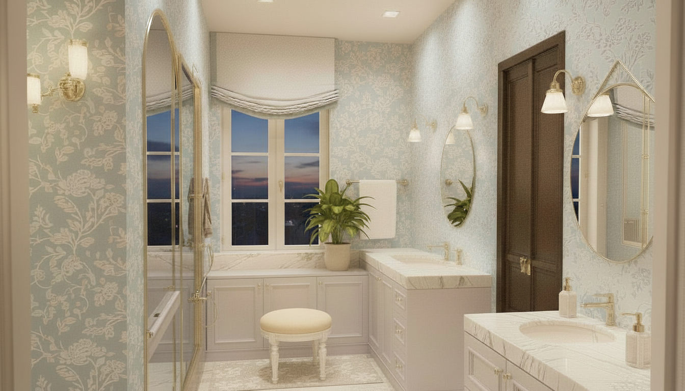add a tall countertop linen cabinet to the back right corner of the vanity