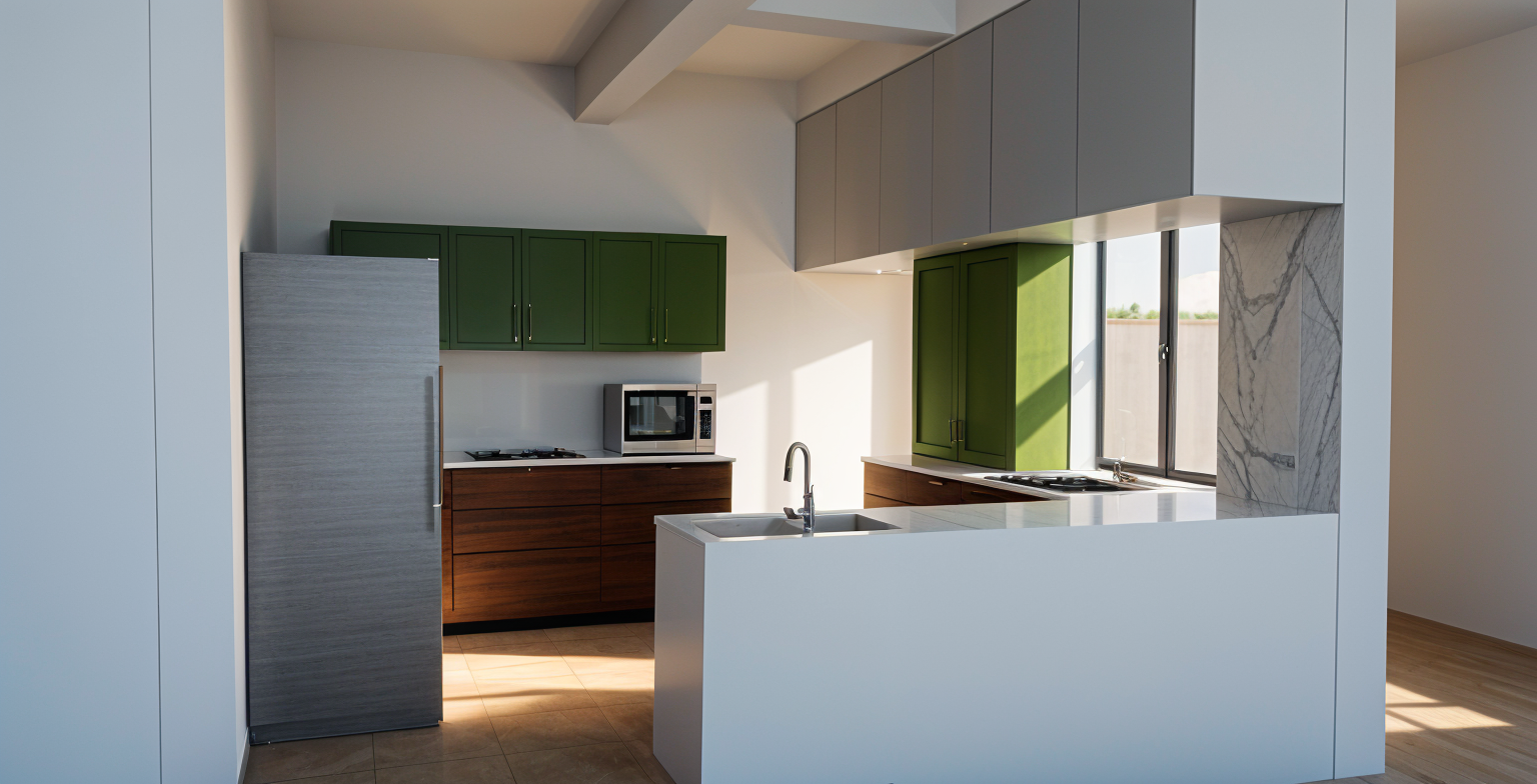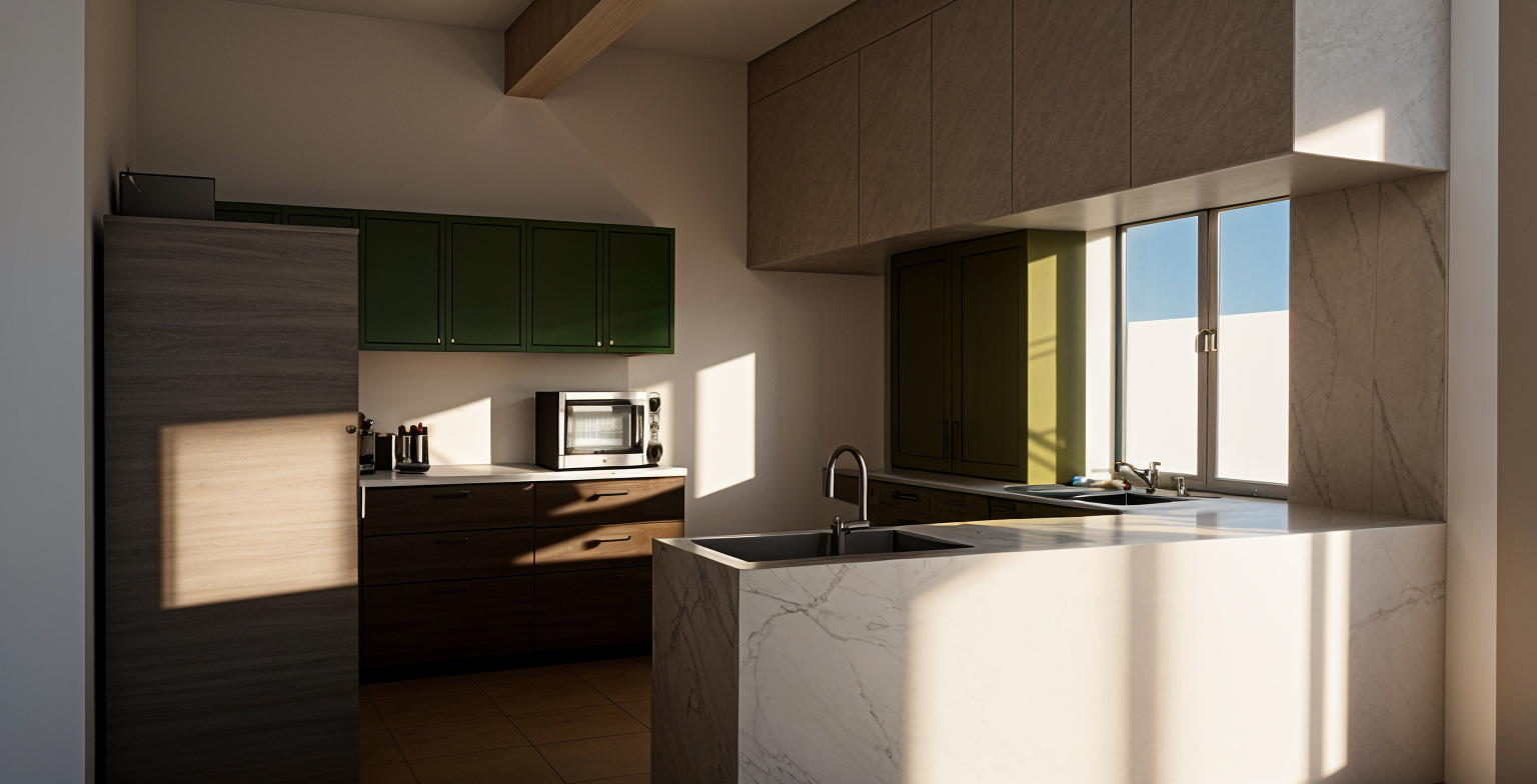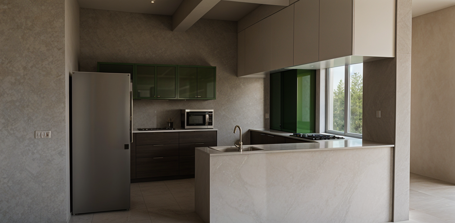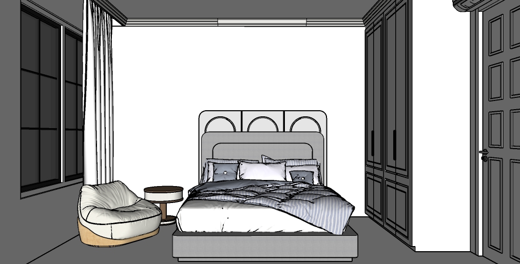 create a modern classic atmosphere for the room by using a bright room creating a very realistic image without changing any structure shape design and materials the walls use grayish white panels the ceiling also has good indirect light the floor uses gray marble with a glossy finish light gray cabinets with gold handles
