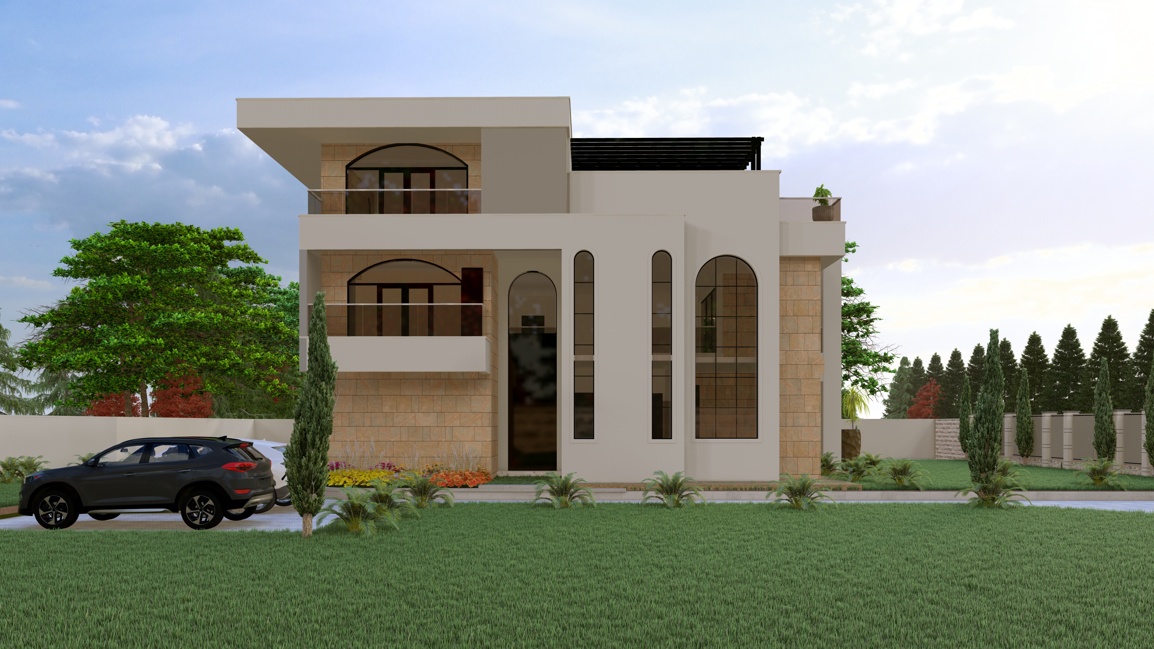 this is a modern mansion with white finished plaster surfaces gray paint on finished plaster and stone finished surfaces keep all materials as they are enhance texture add indoor warm lighting brighten the scene with daylight the windows and doors should have curved tops as they are no adjustments on shapes of any elements add indoor warm lighting yellow ish downlights for cantilevered slabs and wall lights strategically