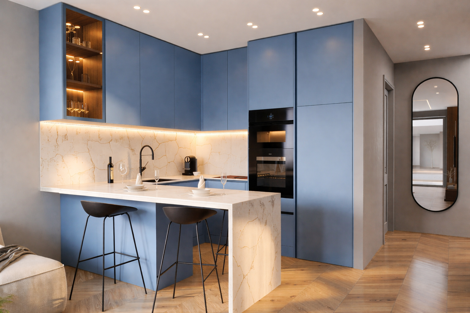 make it ultra realistic image and put some modern accessories on the kitchen island
