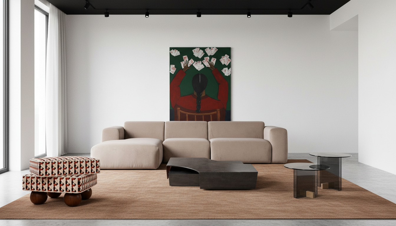 room floor is concrete walls are white ceiling is double height and black the art work is big above the sofa lighting is track light add irregular big brown rug containes cards shapes as in the art work at its corner put the side table besides the sofa add cushions on the sofa in burgandy and olive green i need worm eye view