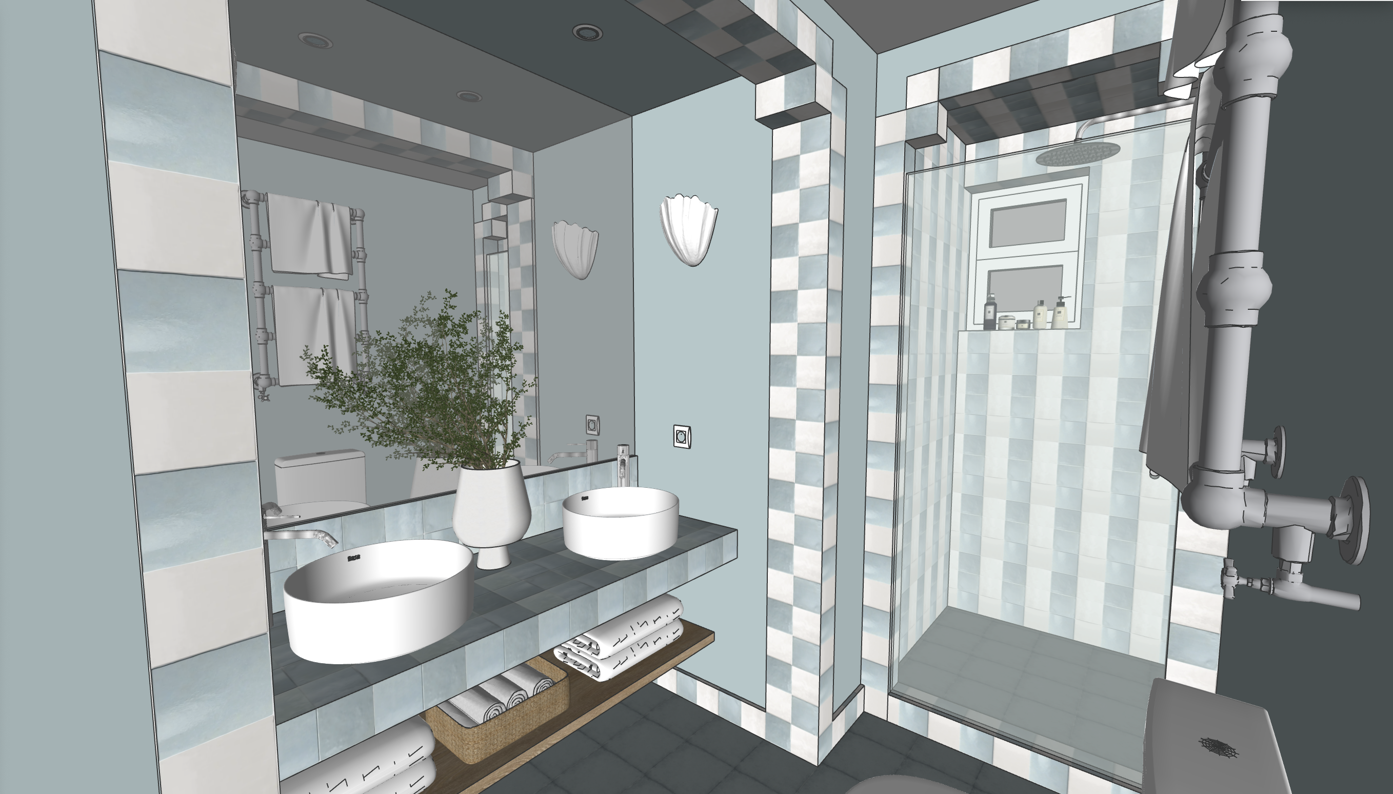 transforme cette image en photo realiste avec une belle lumi re du jour qui rentre par la fenetre de la douche une lumi re chaleureuse qui sort du haut dans appliques murale