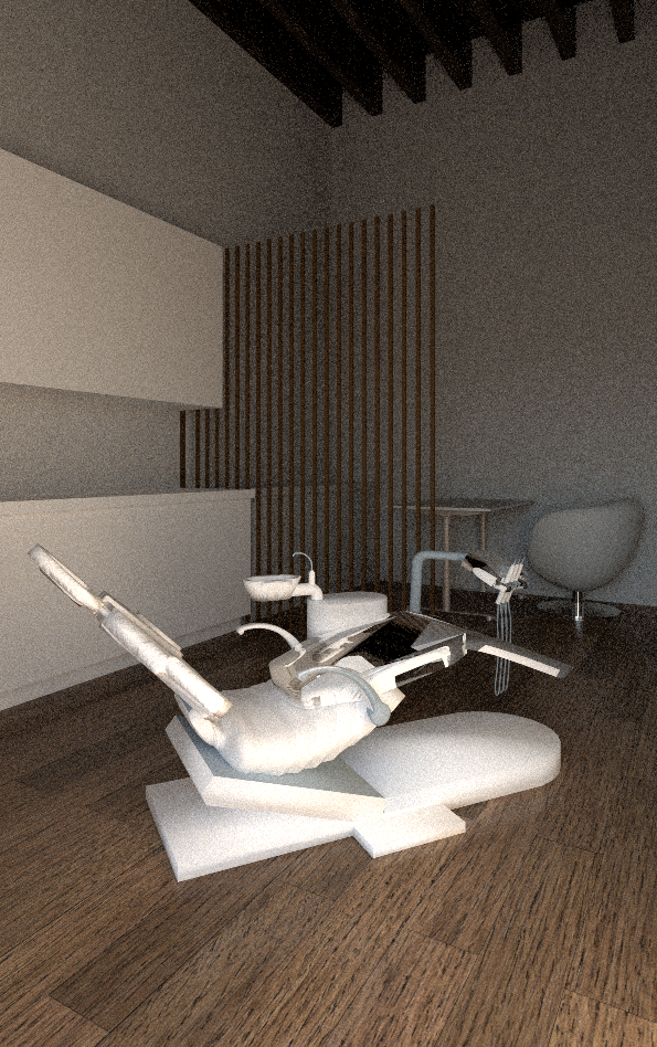 ultra realistic architectural render premium modern minimalist dental clinic interior scandinavian style biophilic design left zone dental chair area white cabinetry integrated storage dental equipment ceiling lamp no windows indirect lighting natural oak wood floor exposed dark chocolate wooden ceiling beams right zone reception desk area modern white desk floating shelves behind desk decorative plants warm lighting small decorative partition wall separating both zones modern texture partial height divider soft daylight simulation cinematic lighting clean composition premium materials professional healthcare design photorealistic 8k quality interior architecture visualization luxury dental clinic concept