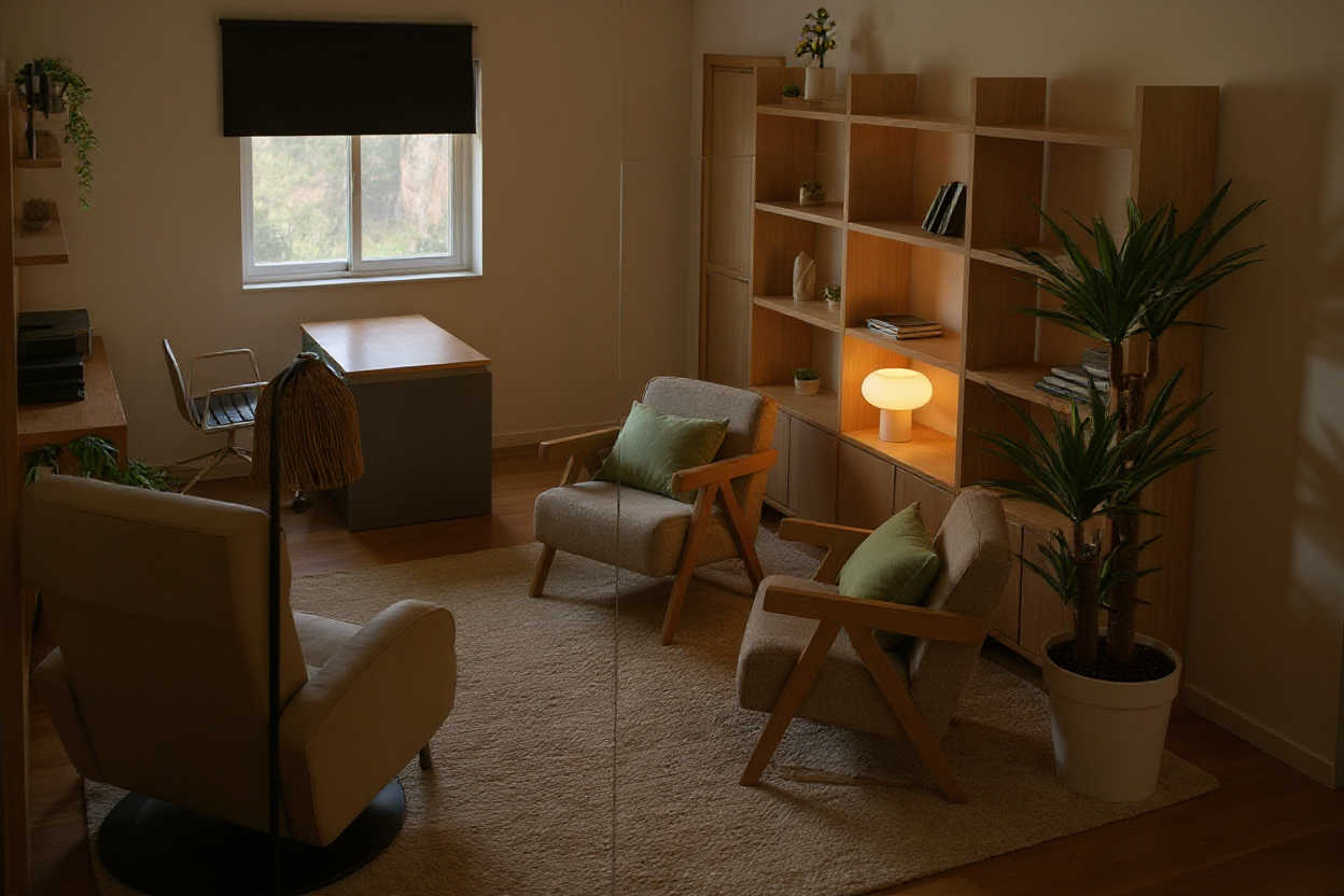 parquet ch ne petit tapis rond beige devant lampadaire allum cocooning mur du fond vert gris cosy chaleureux