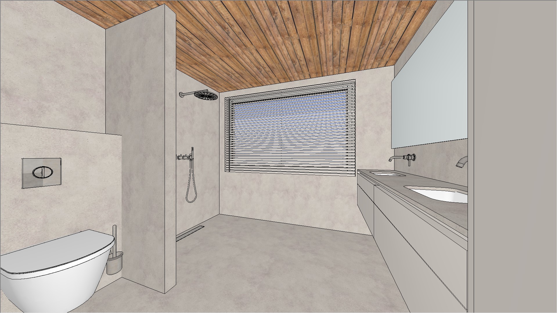 convert this sketchup style image into an ultra photorealistic high end interior photograph mandatory preservation keep the original geometry exactly unchanged do not alter layout proportions camera angle or composition do not redesign or reinterpret any elements material accuracy strict floor and walls mortex finish seamless soft matte subtle texture natural imperfections slightly cloudy variation ceiling sauna style wooden planks warm tone fine grain natural variation high end finish toilet clean white ceramic smooth and refined shower and faucets brushed stainless steel rvs subtle reflections no chrome look countertop calm composite material minimal pattern refined and understated color mood lock preserve the intended serene calm atmosphere no harsh contrasts or exaggerated colors natural soft warm neutral tones do not oversaturate or stylize lighting luxury spa feel soft indirect lighting with realistic shadow falloff subtle highlights on materials especially mortex and rvs no overexposure no artificial brightness calm diffused light as in a high end spa environment realism high end photorealistic materials with micro detail and depth accurate reflections and soft shadows slight natural imperfections to avoid cgi look moisture realism in wet areas very subtle not exaggerated rendering style premium architectural photography clean minimal serene luxurious depth softness and realism over sharpness or contrast negative constraints no redesign no material changes no color shifts no glossy plastic look no over lighting no stylization or artistic interpretation only transform the image into a realistic high end bathroom photograph while preserving the exact design