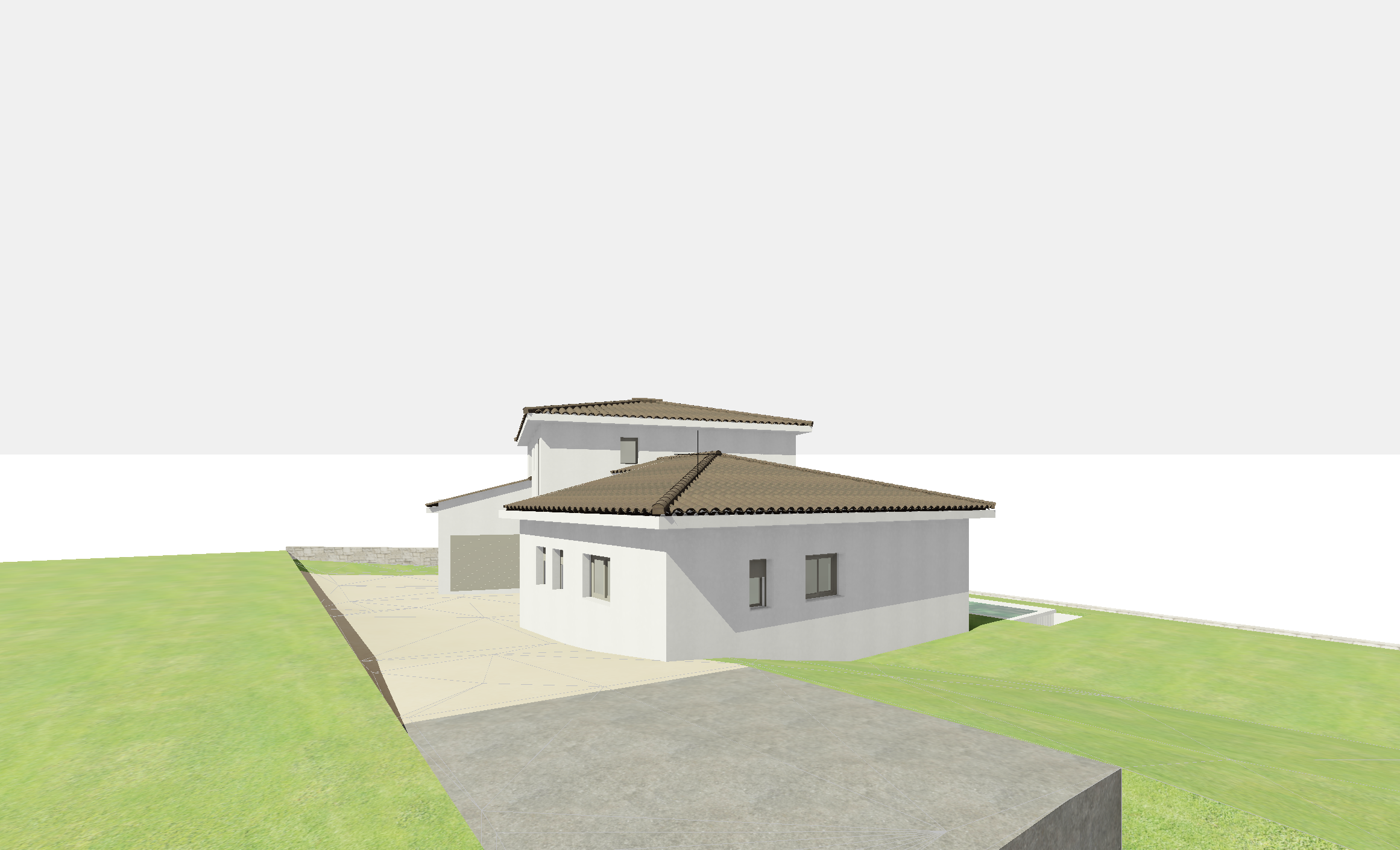 mediterranean landscape in the backgound lot of light and reflects in the windows add some mediterranean pine trees and olive trees more sun on the facade some palm trees conserve the angle of view