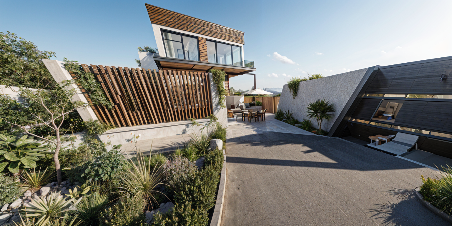 a modern terrenced house with houses on its side by side matte black metal gate and fence reflections and a vibrant clear sky with light atmospheric depth render in hyper realistic architectural visualization quality unit number 42 top of the windows maintain textures