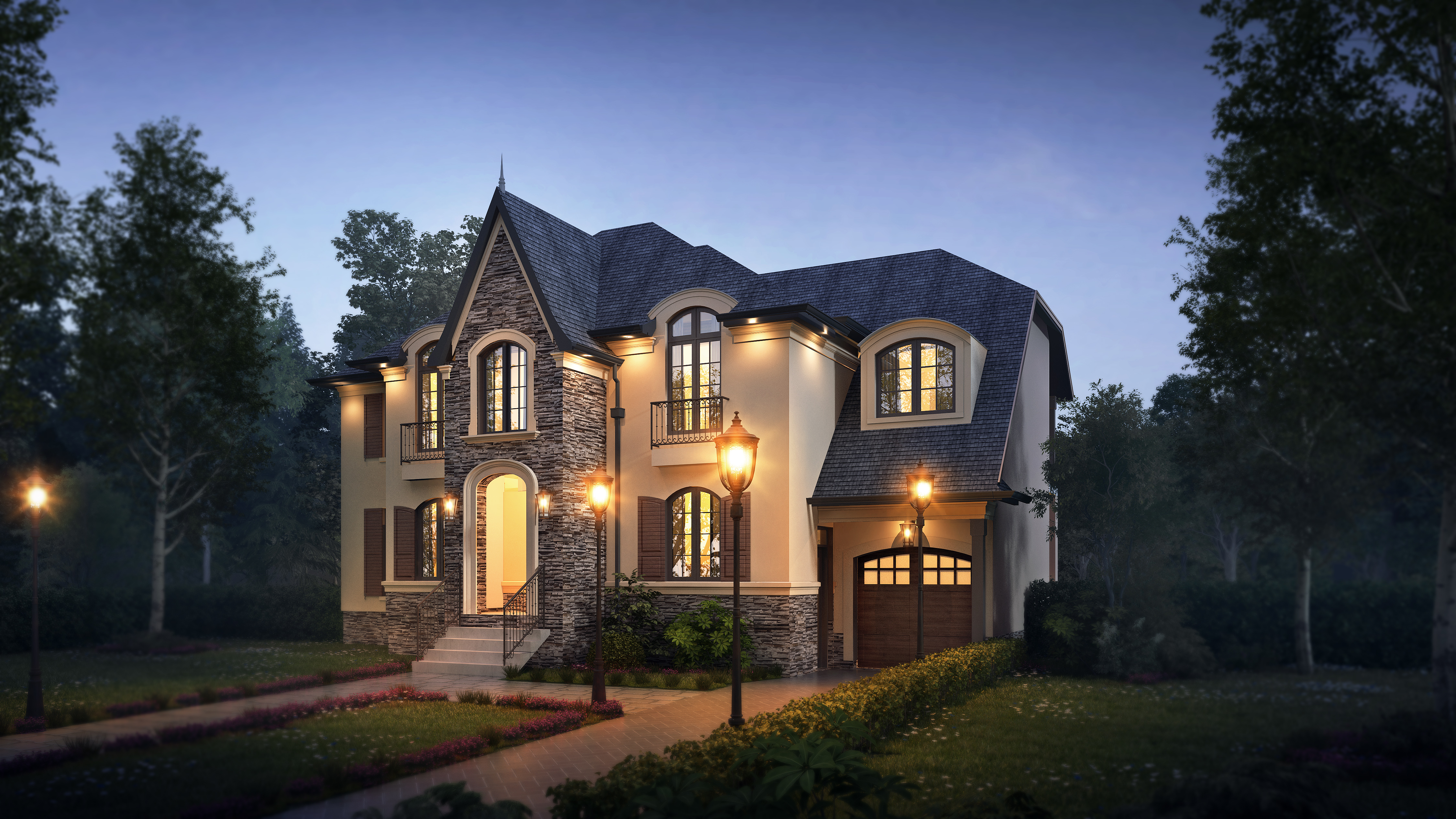 create a daytime rendering with stucco on main walls