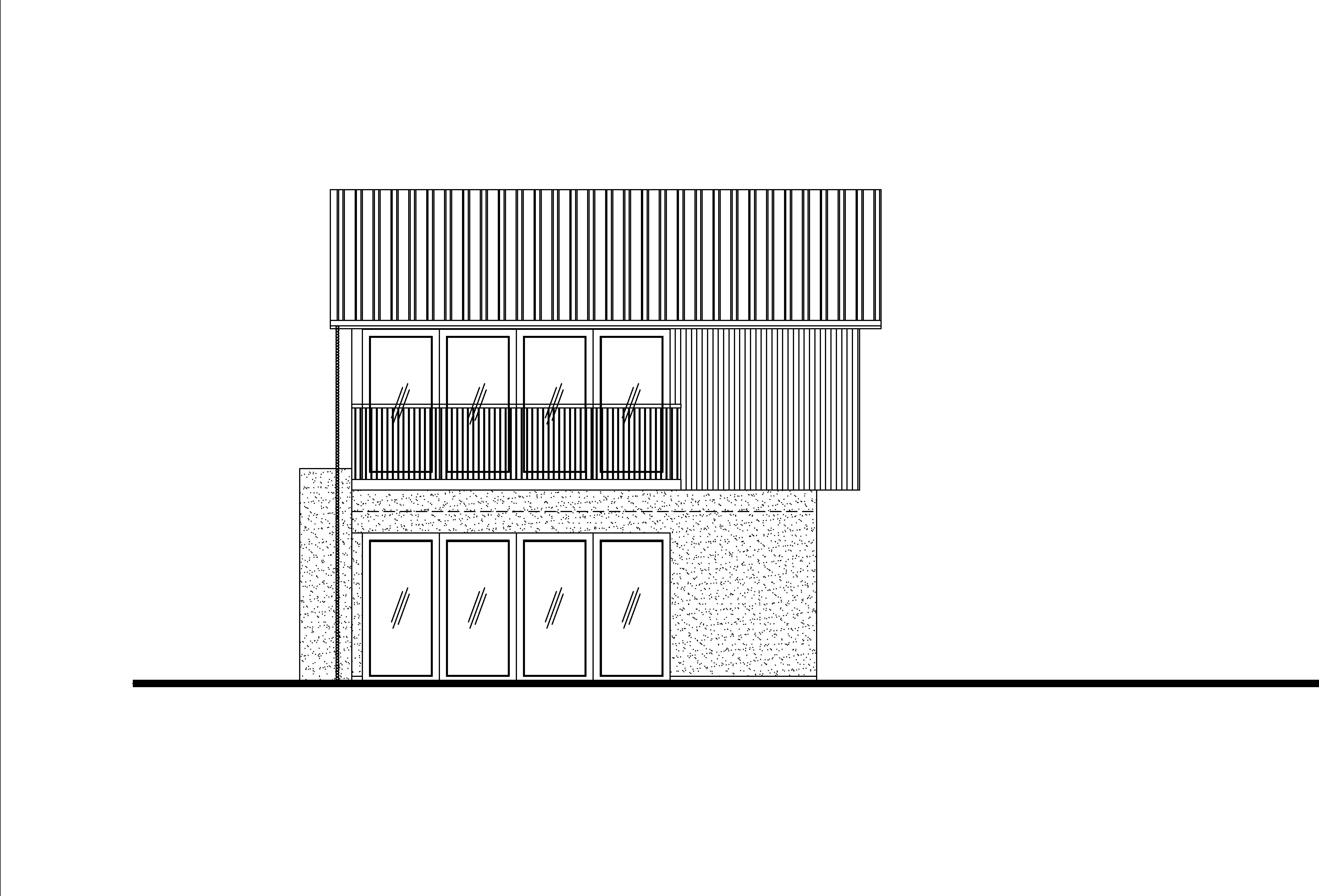 rendered elevation of an adu the suburb of san mateo california redwood tree to the left dark gry stucco on the bottom level verical backened wood siding on the upper level black metal hardware on the balcony slate grey metal seam standing roof on the roof