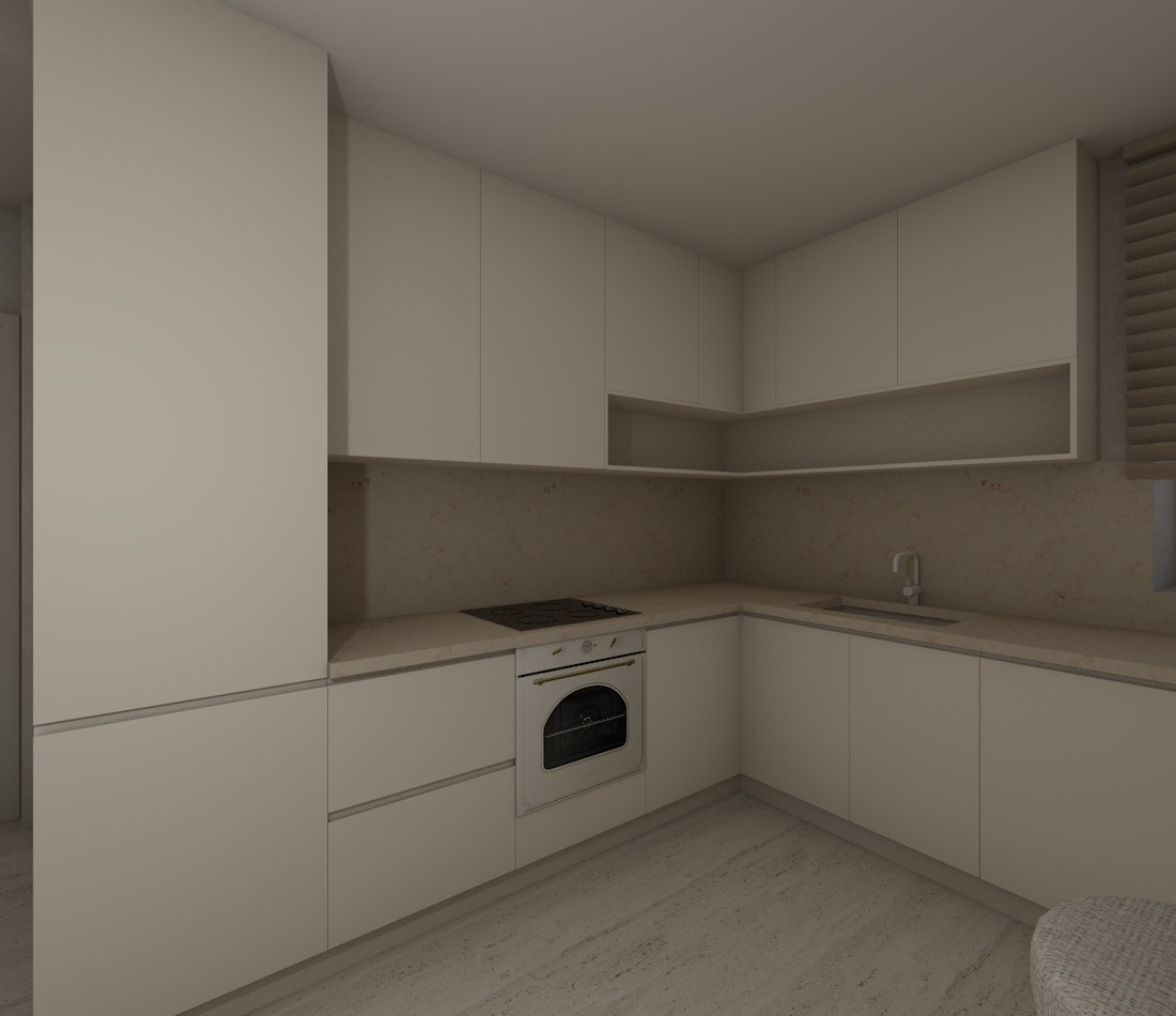create a highly realistic render of a modern kitchen in a coastal home with a calm warm and refined atmosphere the design is minimal and cohesive inspired by seaside living with a soft neutral palette that evokes natural light sand tones and a relaxed elegance the kitchen layout is linear with an l shaped extension featuring clean handle less cabinetry in a light beige tone with a matte finish the surfaces appear smooth and seamless the countertop and backsplash are in a natural light beige stone reminiscent of sand and coastal textures with subtle variations and a soft matte finish a hidden led strip is installed beneath the upper cabinets providing soft indirect lighting that gently illuminates the backsplash and enhances the warm ambient atmosphere in the foreground bright