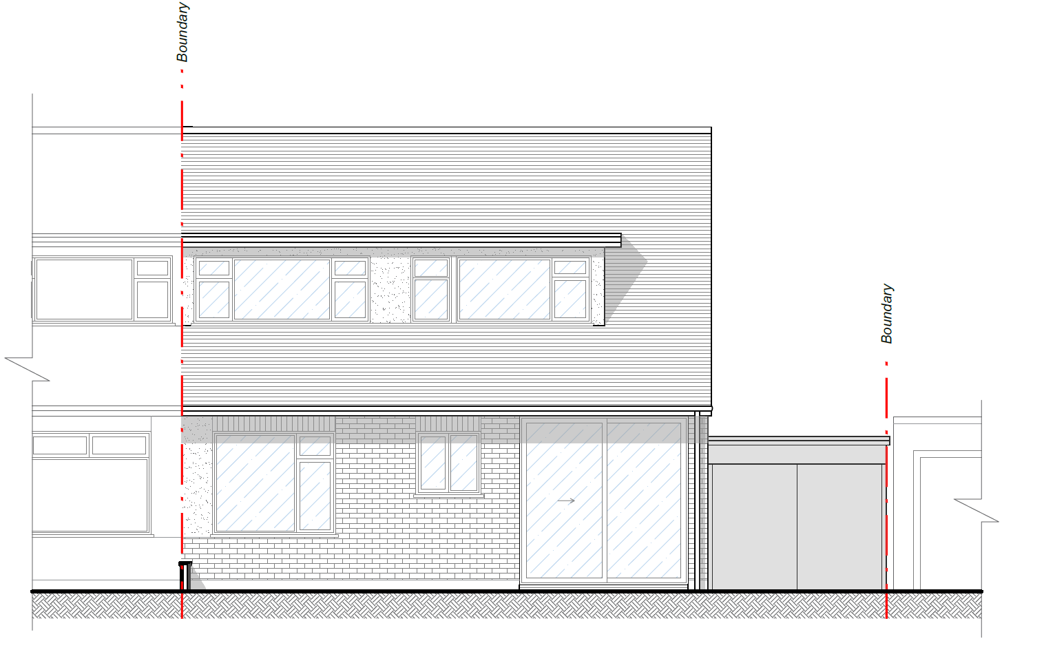 realistic architectural render of the existing rear elevation of a uk suburban bungalow keep the building exactly as shown in the reference photo maintain existing roof pitch and concrete interlocking roof tiles keep red brickwork fa ade retain white upvc windows and rear door positions retain flat roof side structure on the left keep existing patio and lawn layout match realistic british daylight conditions natural shadows professional property photography style no redesign no additional extensions no modernisation accurate proportions and perspective