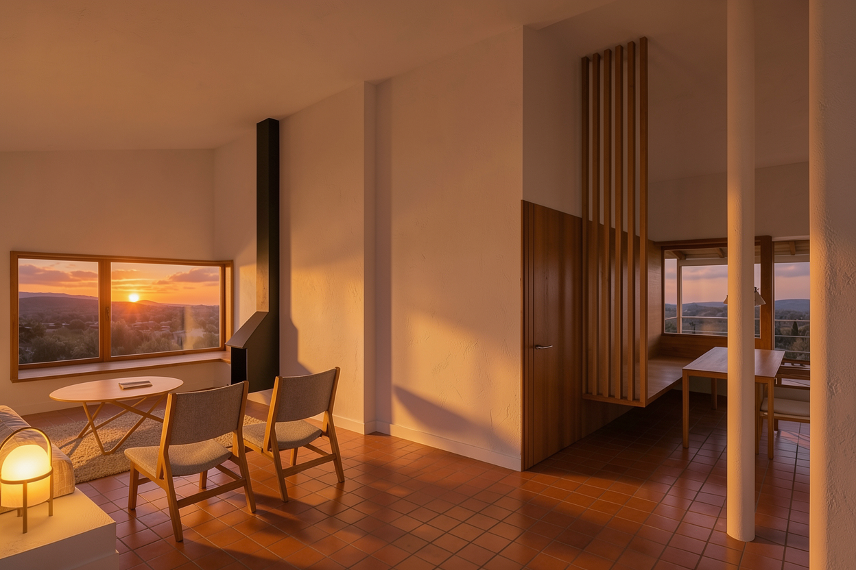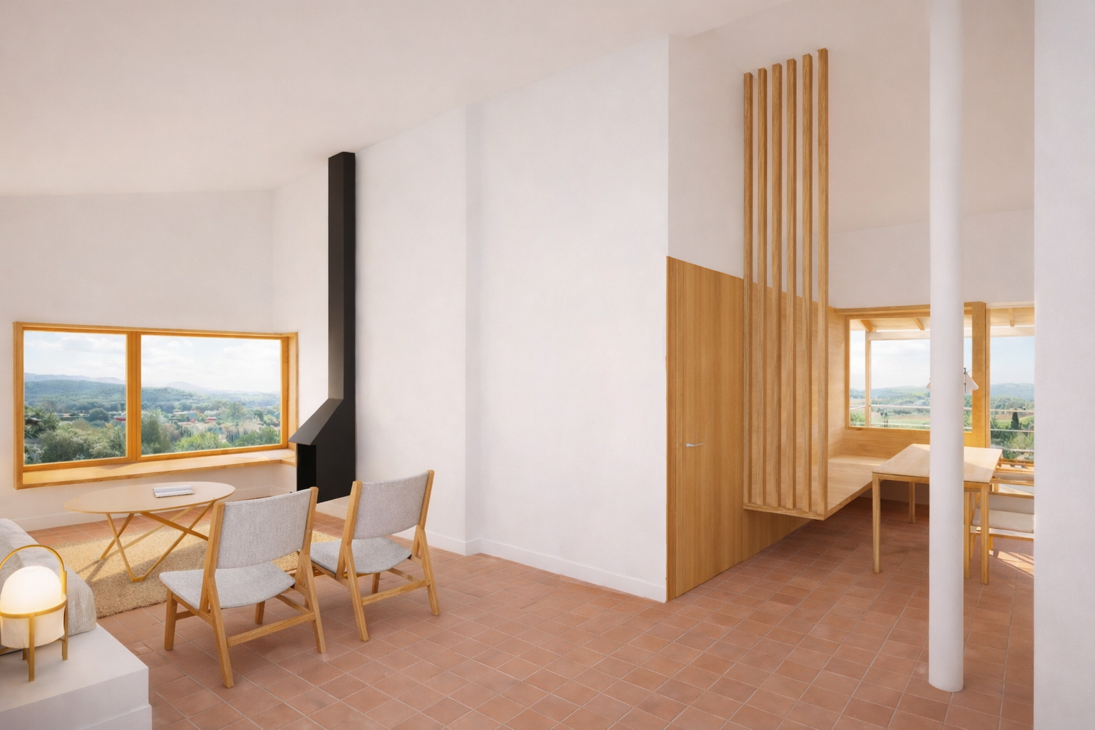 lighting sunset but not dramaticadd light to the foreground lamppavement handmade effectwood windows improve keep colours of the chairthe flooring should be terracotta colored ceramic tiles with a satin finish very low reflectivity a subtle handcrafted character turn on hanging lamp below the column