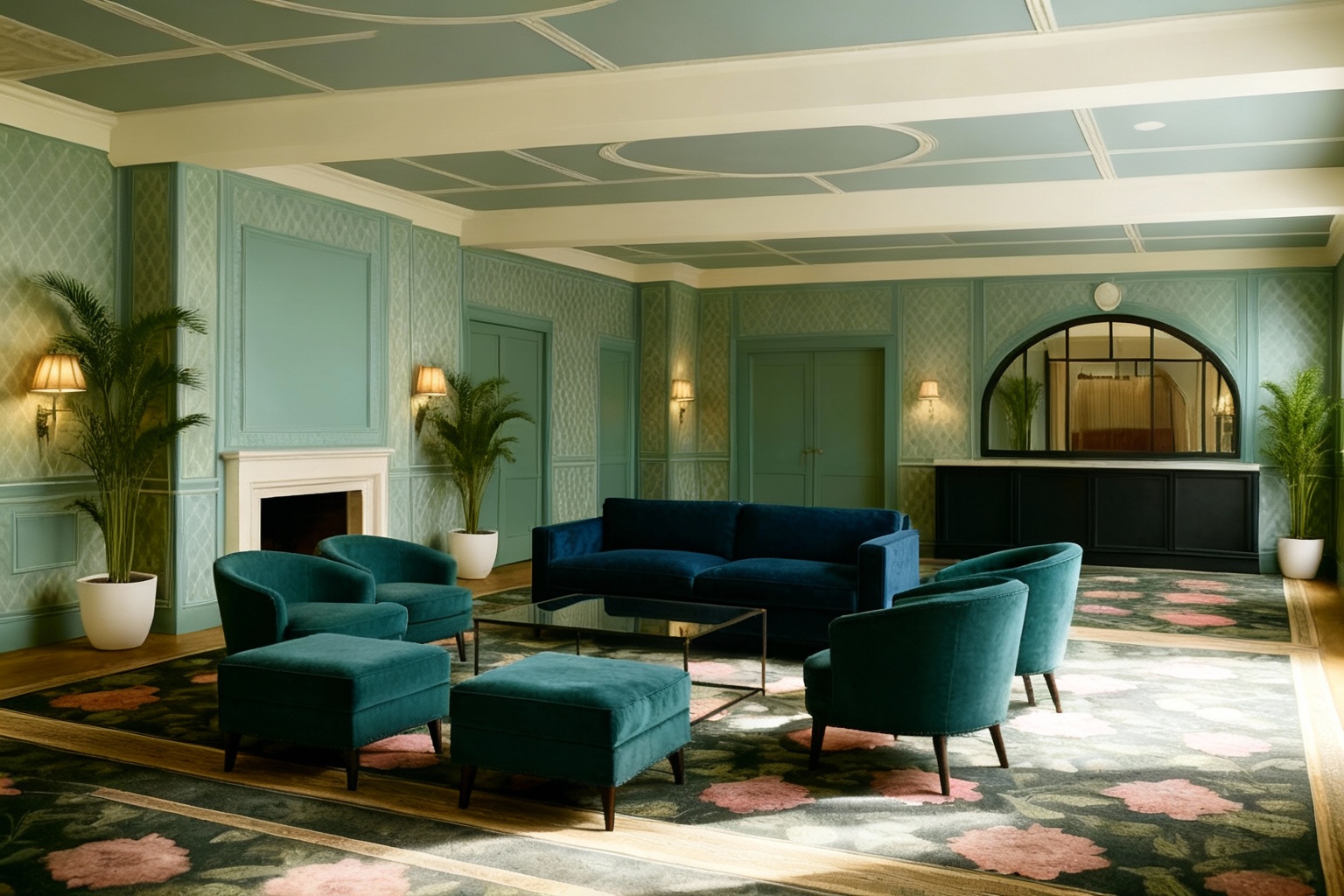 transform the lounge chairs to an upholstery with a printed fabric in off white with paisley green leaves
