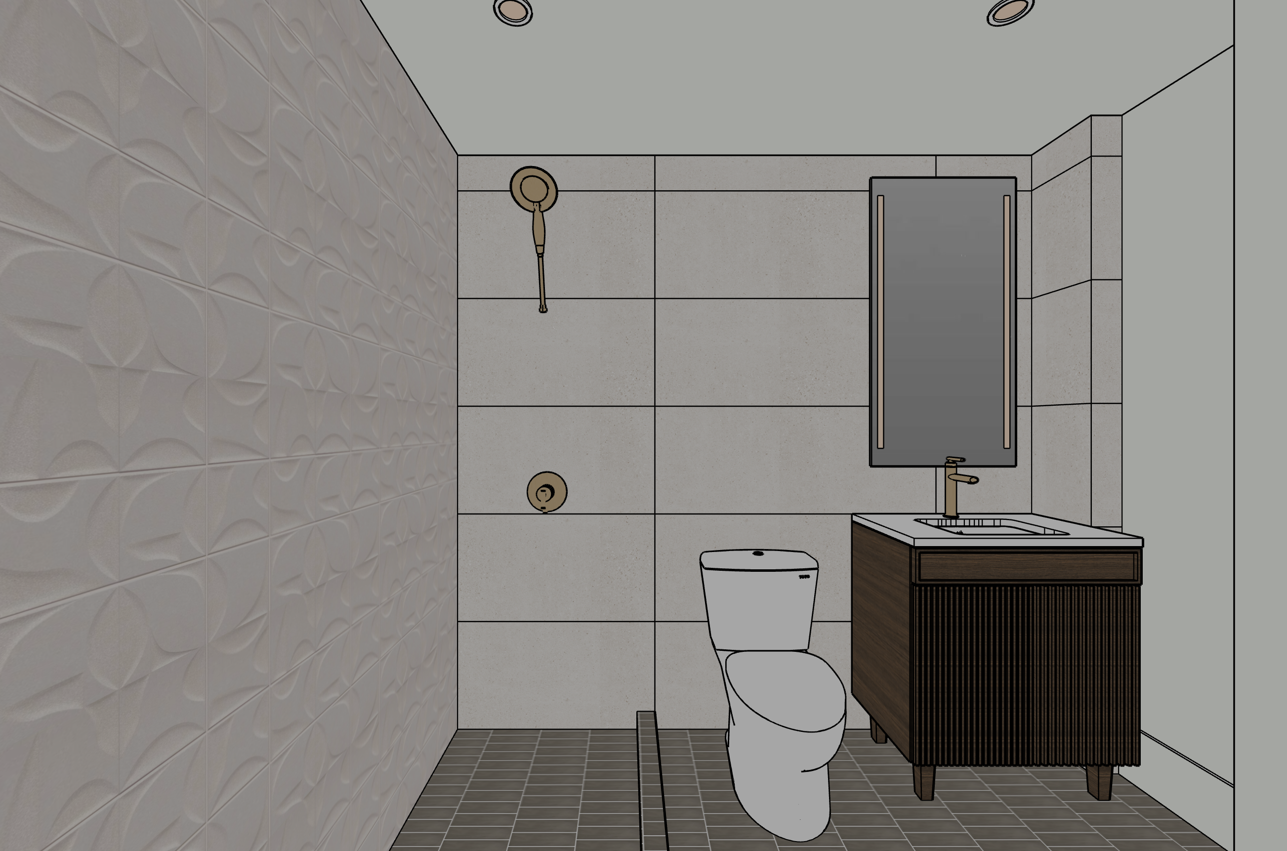 photorealistic enhancement of the provided architectural render preserve the exact architecture layout materials furniture placement and fixtures from the original image with no redesign or modifications the purpose is only to improve realism and lighting quality apply physically accurate global illumination and natural light behavior lighting should feel balanced and natural as in professional interior architectural photography soft indirect daylight fills the space with gentle light bounce from surrounding surfaces shadows are soft subtle and physically realistic with natural falloff all materials remain unchanged but respond to light more realistically stone surfaces with natural micro texture wood grain with depth matte flat painted walls with soft diffusion and brushed metal fixtures with correct reflections no surfaces emit light unless they are actual light fixtures plumbing fixtures such as shower heads and faucets must remain non emissive and only reflect ambient light metallic fixtures reflect light but never emit light the finishes should never have altered color or patterns render as high end interior photography using a full frame camera with a 24 35mm architectural lens balanced exposure realistic dynamic range subtle depth of field and natural color grading the image should look like a professionally photographed luxury interior rather than a computer render the scene should be bright but without unrealistic or unnecessary shows do not change architecture do not change materials no redesign no new objects no additional lights no glowing fixtures no light from shower heads or faucets no dramatic shadows no surreal lighting no warped geometry no stylization the plumbing fixtures and bathroom faucet should all be brushed brass the can lights in the ceiling should be emitting light and brightening the space the tile color and overall nature should not be altered the back wall tile should be white matte with subtle limestone texture the floor tile pattern should not change the led mirror should be turned on and shining light through the two light strips lastly the reflection in the mirror should show a solid white wall the floor pattern needs to be identical to the original image remove the gold shower drain