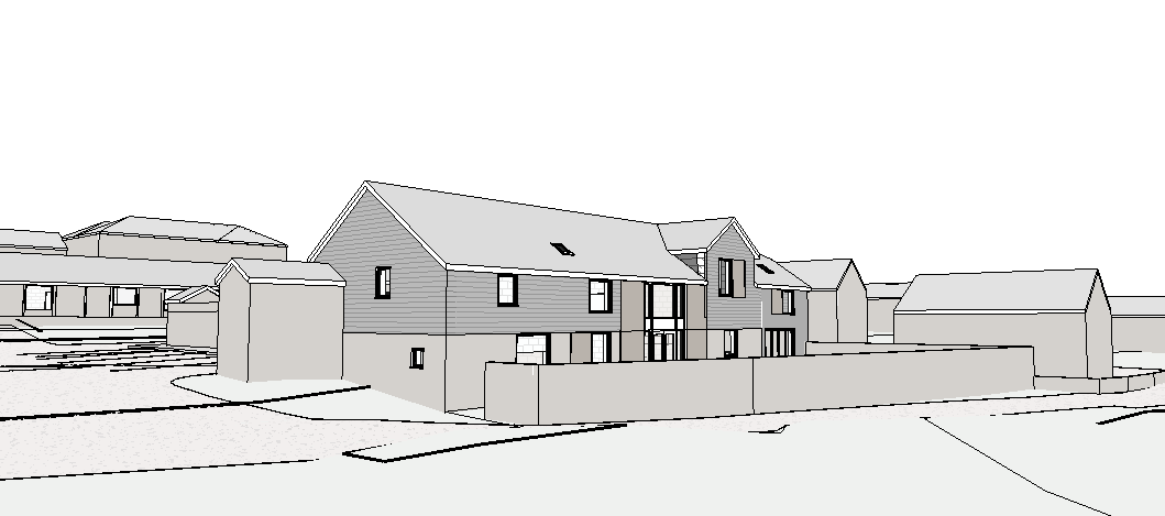 render red brick and wooden clad barn conversions set in the english country side and surrounded by ex agricultural buildings that have been refurbished there should be some trees in the background of the image and it should show a bright spring day