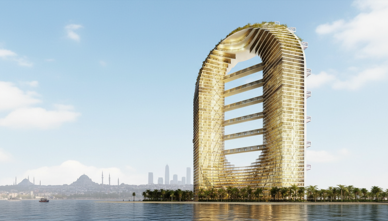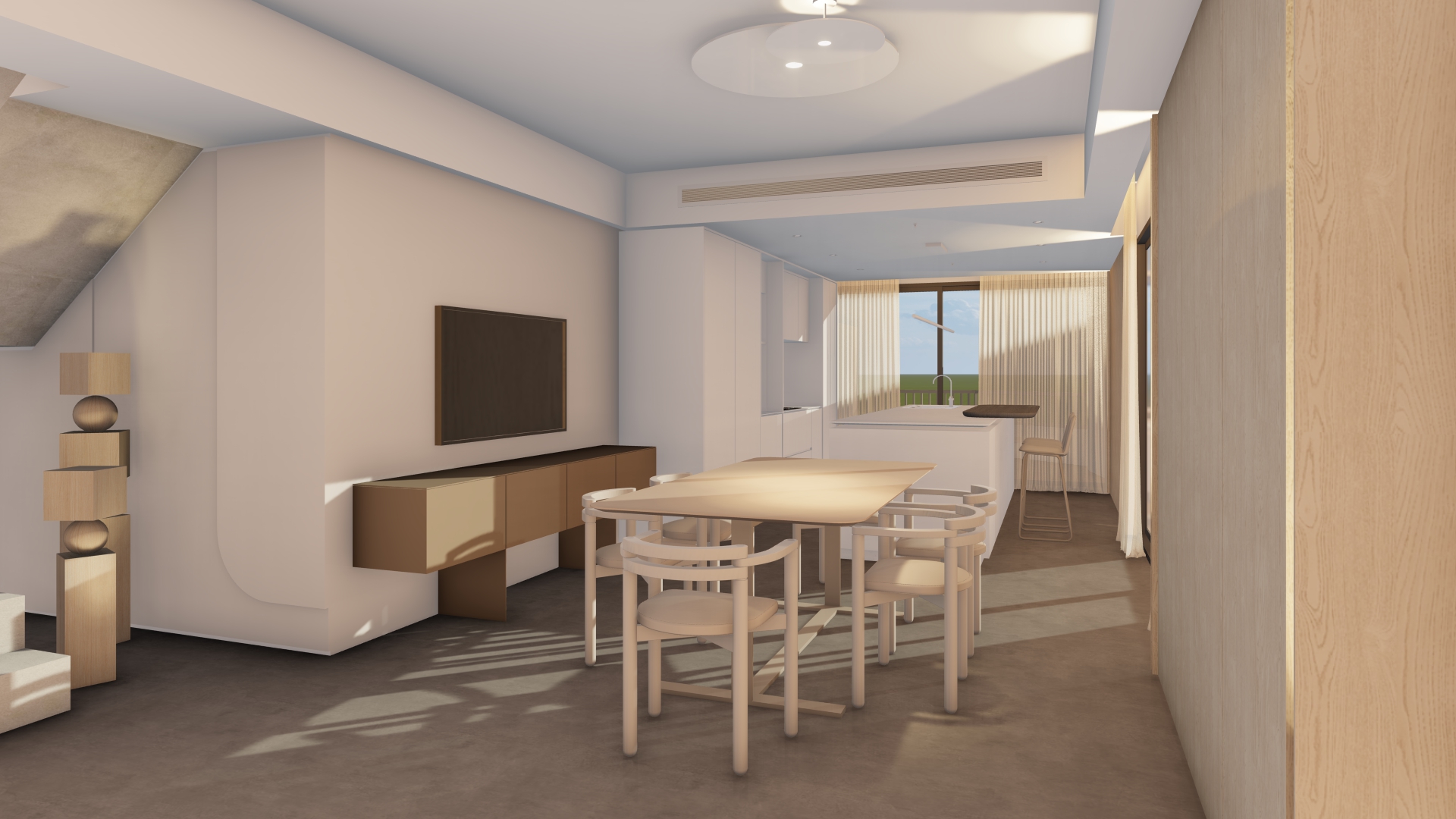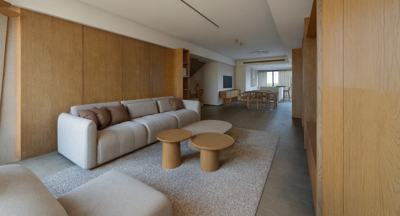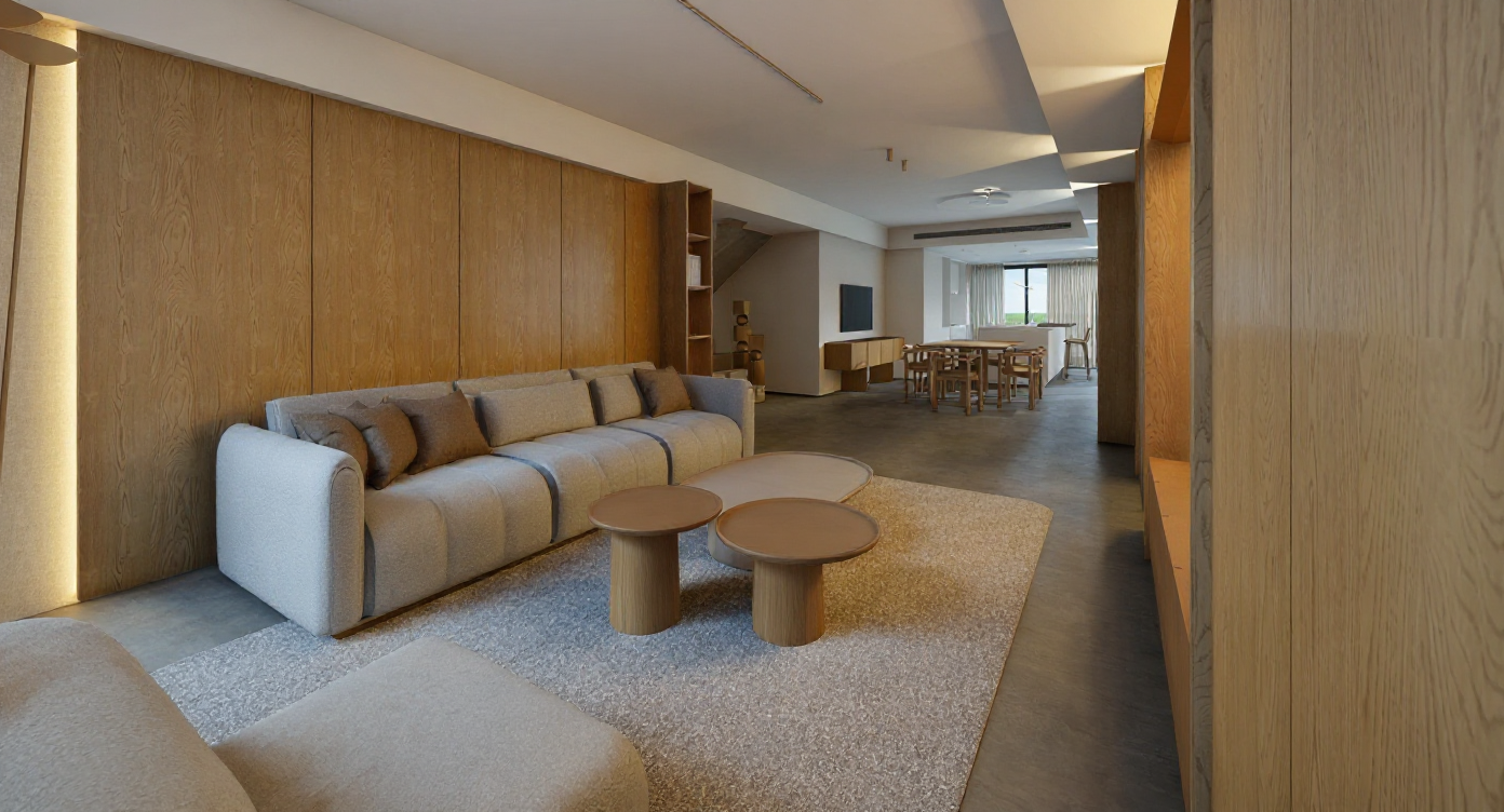 render this image in a realistic style maintaining the exact same composition furnishings lightning and design without adding or removing elements the floor is gray ceramic like polished concrete and the wood is light brown almost desaturated