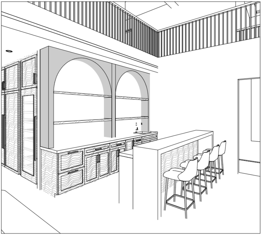 render this into full 3d rendering with materials a neutral color palatte soft beiges tans white linen with taj mahal quartz counter tops mirrors for behing the bar wall add some accessories on the selve glassware but also organic pottery to fit the scale of the shelves dark wood accents for the spindles etc the floors will be a white oak