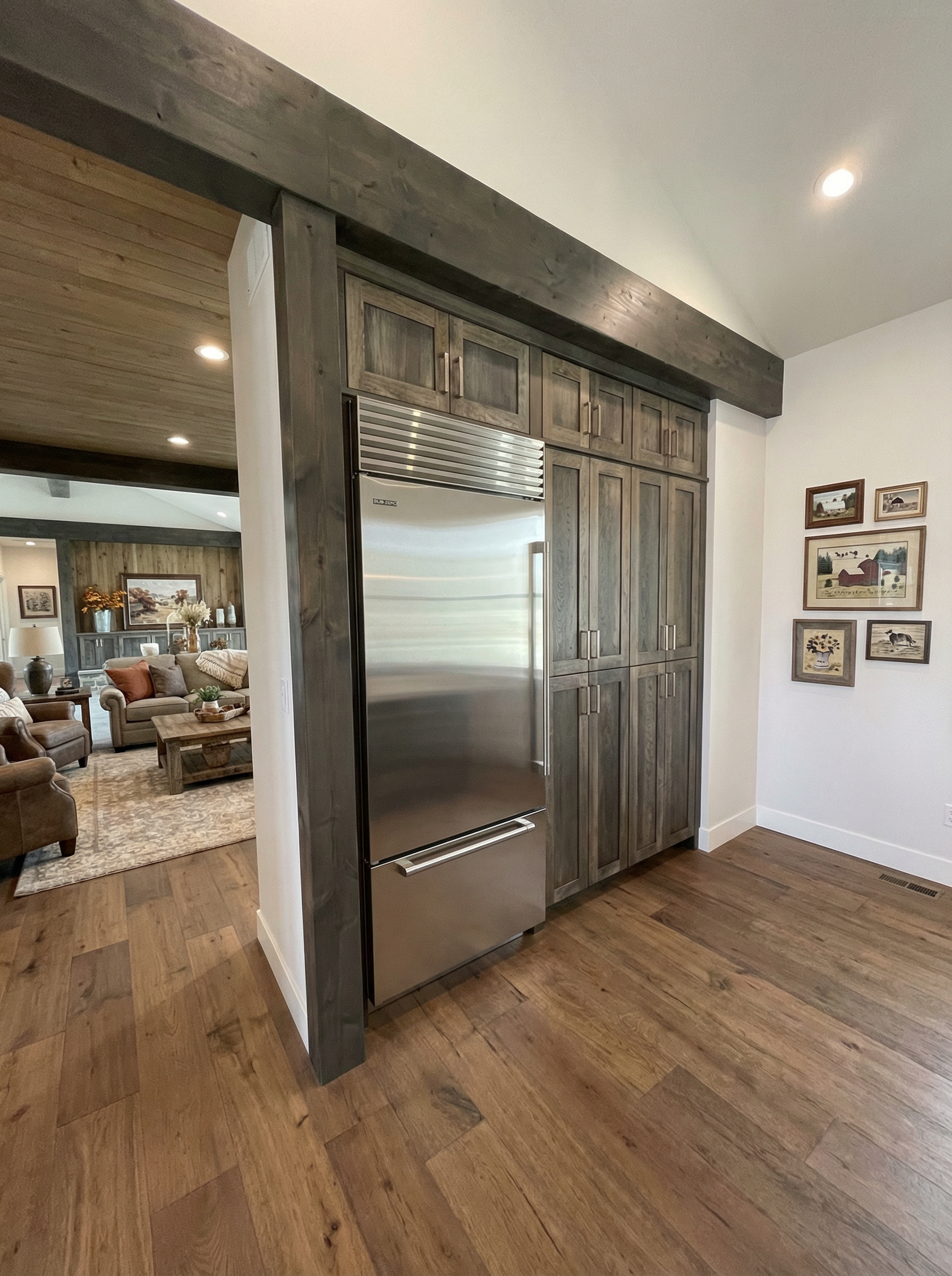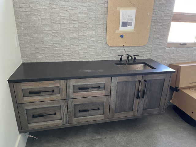 do not change the cabinets in any way preserve the exact cabinet colors materials finishes dimensions door and drawer styles hardware spacing alignment and all geometry exactly as shown do not alter the countertop shape backsplash appliances flooring lighting fixtures or wall structure only remove the construction materials clutter and mess from the scene clean the room and make it look finished and staged add a few simple tasteful home accessories appropriate for the style of the space but do not add or remove any furniture windows or architectural elements maintain the original lighting direction and realism enhance clarity and polish the photo while keeping the cabinetry and room design completely unchanged do not alter the lighting to keep the cabinet colors as they are in the image add a mirror above the sink add a view out the window stage the countertop for a modern industrial bathroom remove the wires under the cabinet