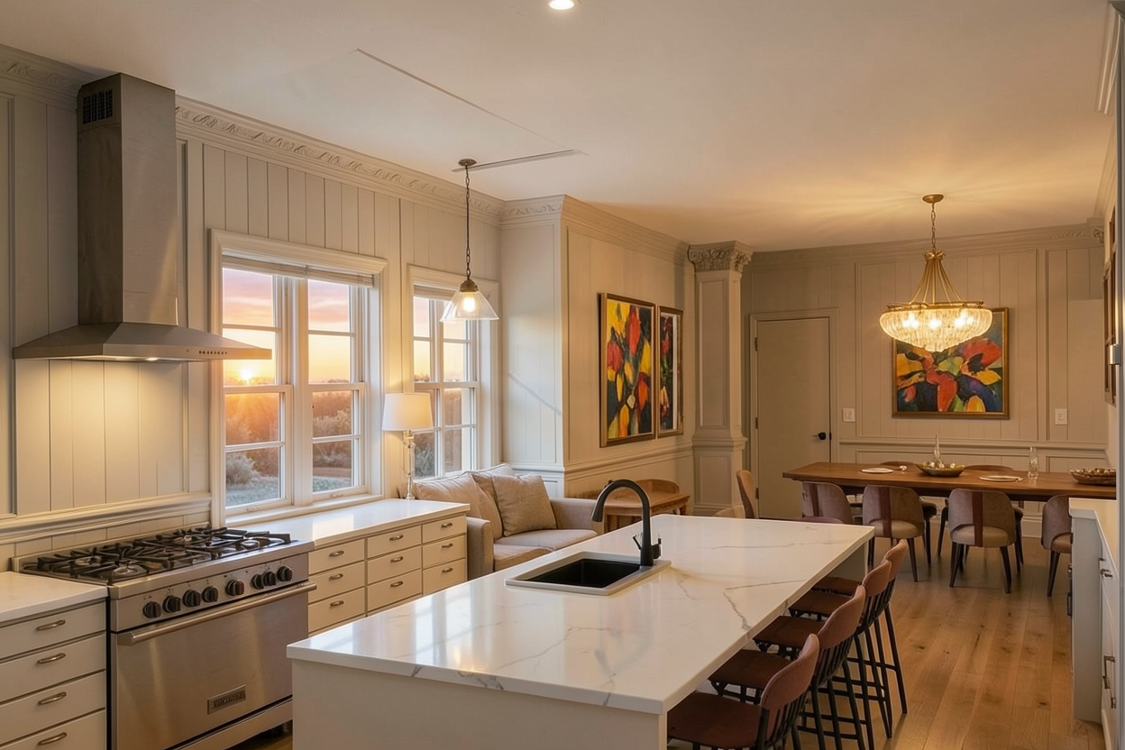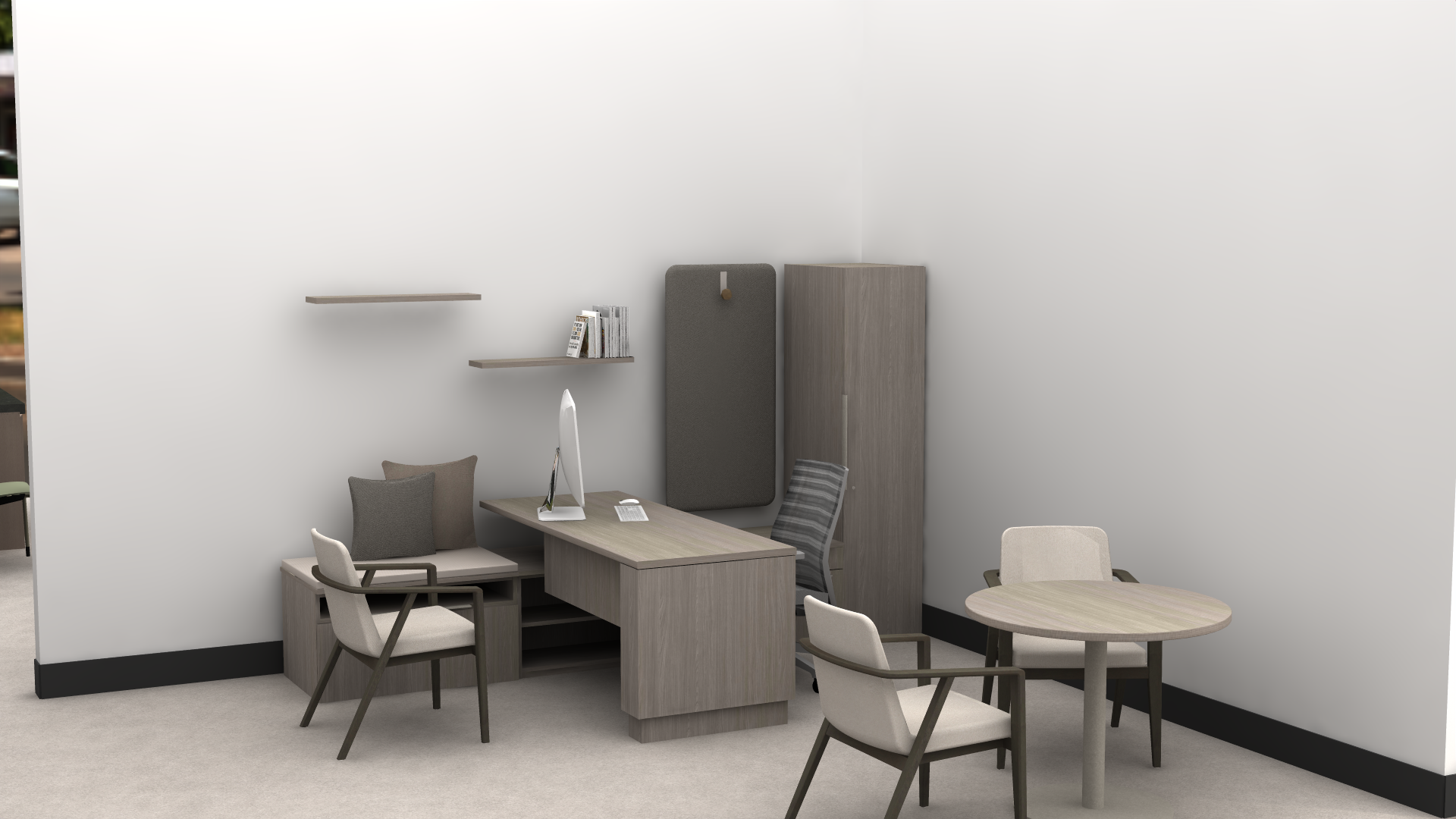 modern but moody sophisticated executive office desk is an ash wood finish keep flooring as polished concrete add lighting office is on 2nd floor of an office building in a residential area back desk portion is not built in but furniture do not add anything else to the wall or make it look like millwork make room feel professional but cozy add diplomas to the wall