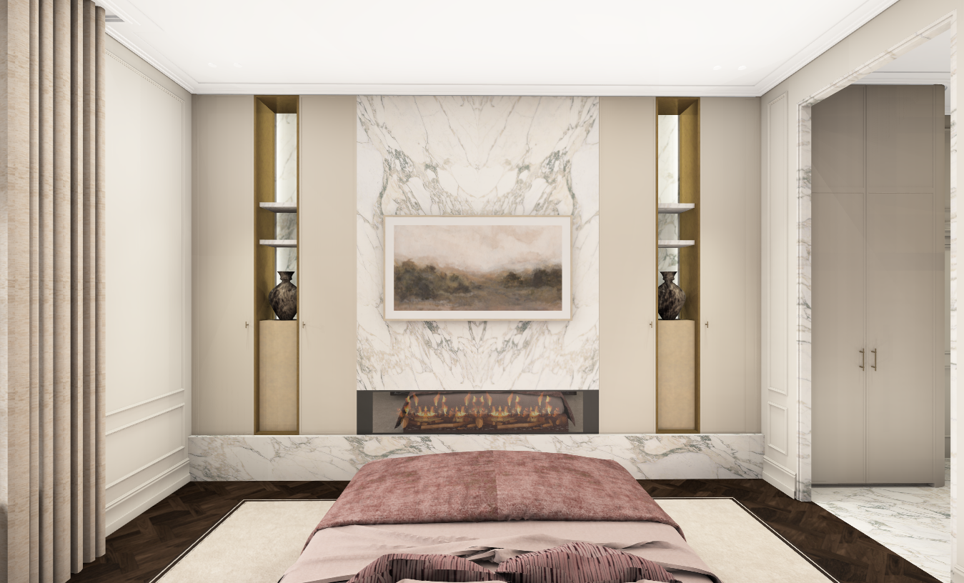transform this image into an ultra realistic 3d photorealistic render preserve the exact original perspective camera angle proportions composition and geometry without any distortion or changes use physically accurate materials pbr with clean flawless surfaces no dust no scratches no damage no imperfections apply natural lighting with global illumination soft shadows and ambient occlusion use a professional full frame camera look with accurate focal length and balanced exposure ensure sharp high resolution output 8k quality with realistic but clean reflections and smooth surfaces maintain true to life colors and contrast no stylization no artistic interpretation strictly clean pristine photorealism add vertical lighting in the niches make the fire look realistic make the cabinets the same color as the walls