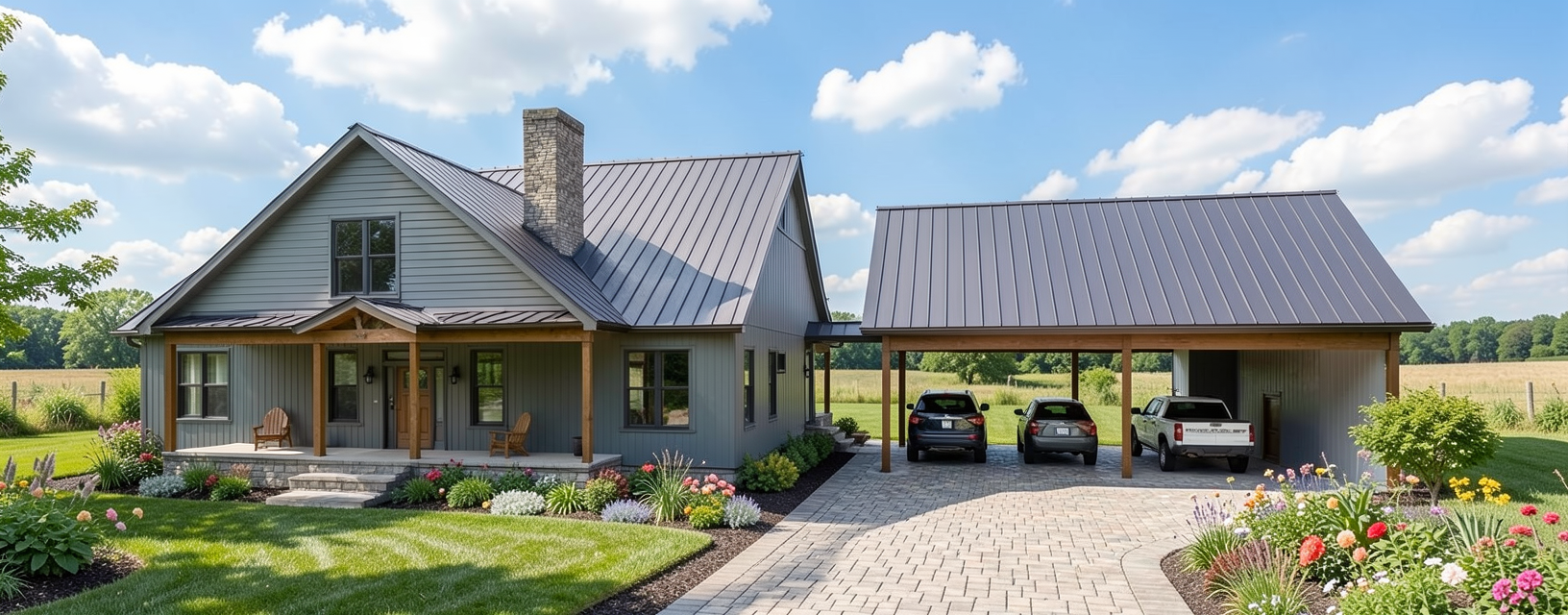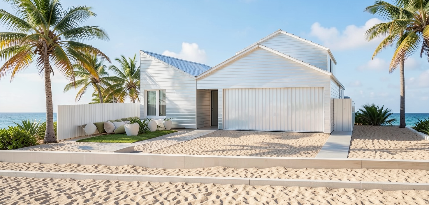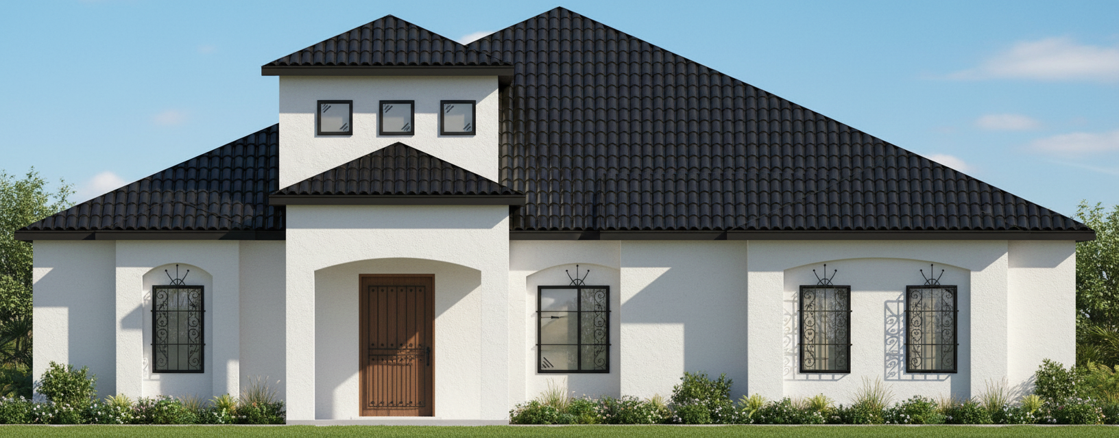 generate realistic beautiful elevation render with light inside with white stucco on front walls and black tile roof