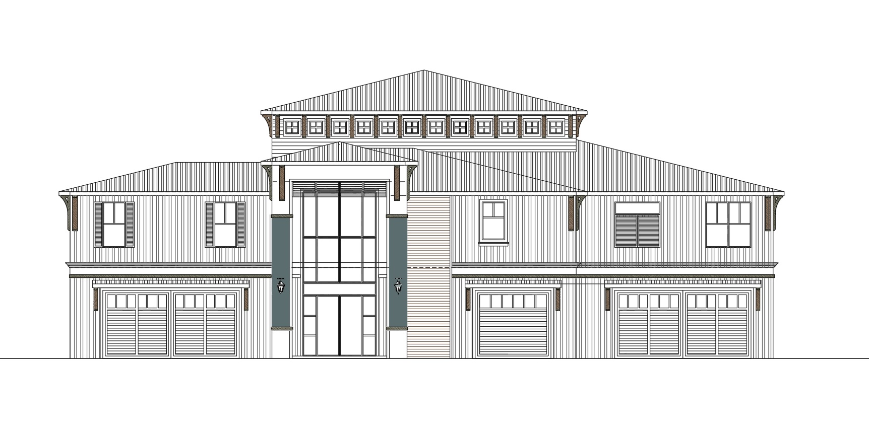 a realistic modern farmhouse white and with metal dark gray roofing the upper right walls have white board and batten exterior walls the lower portion of the house are with light gray color walls board and batten the front columns have a marble light gray accent the foyer entrance is cladded with greyish wood the main door is full glass the garage doors are canyon ridge chevron walnut color and are covered with shed roof overhang on all 3 garage doors there is a wall panel on the right of entrance cladded with wood horizontal planks surrounded by lush greenery in florida setting surround it with palm trees and a dawn setup with lights lit up and the house shows