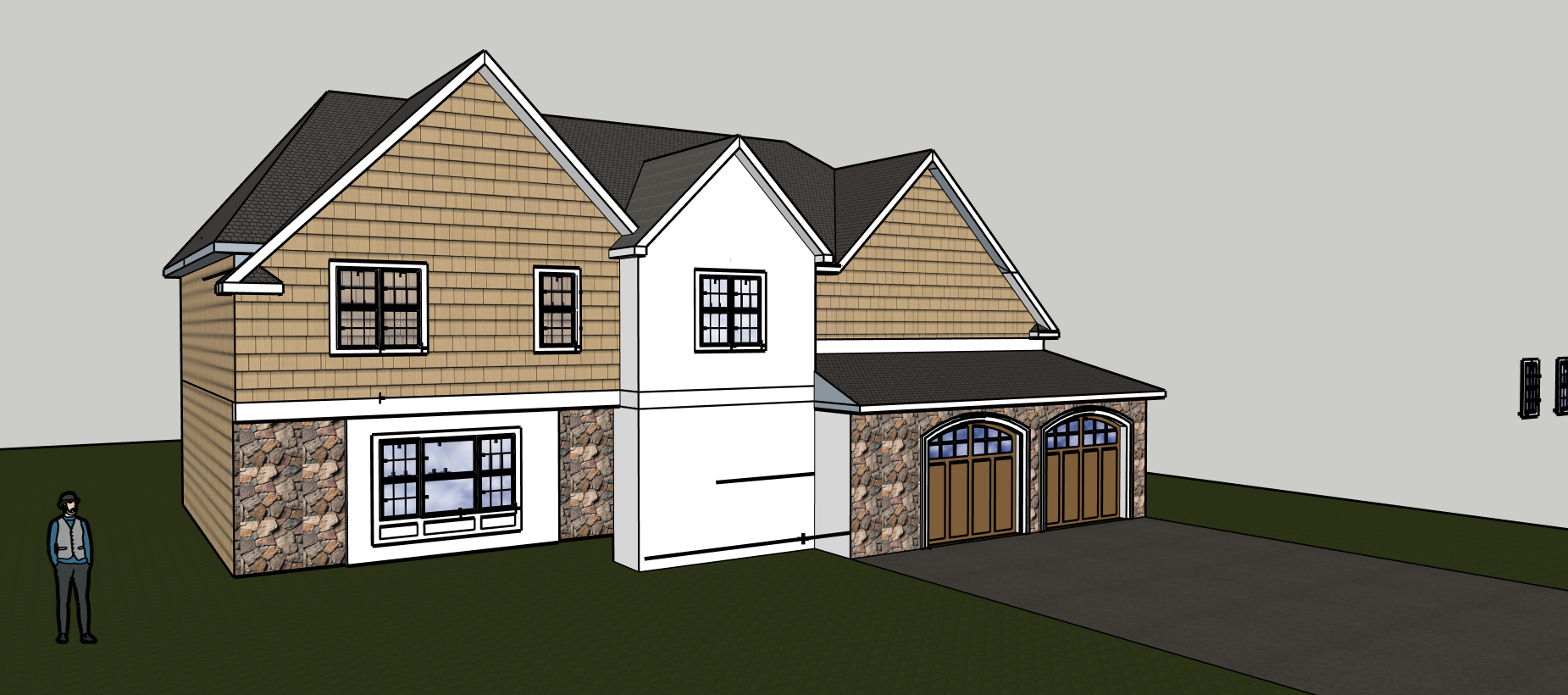 realistic rendering with trees behind the house sunny day with clouds and a car inn the driveway