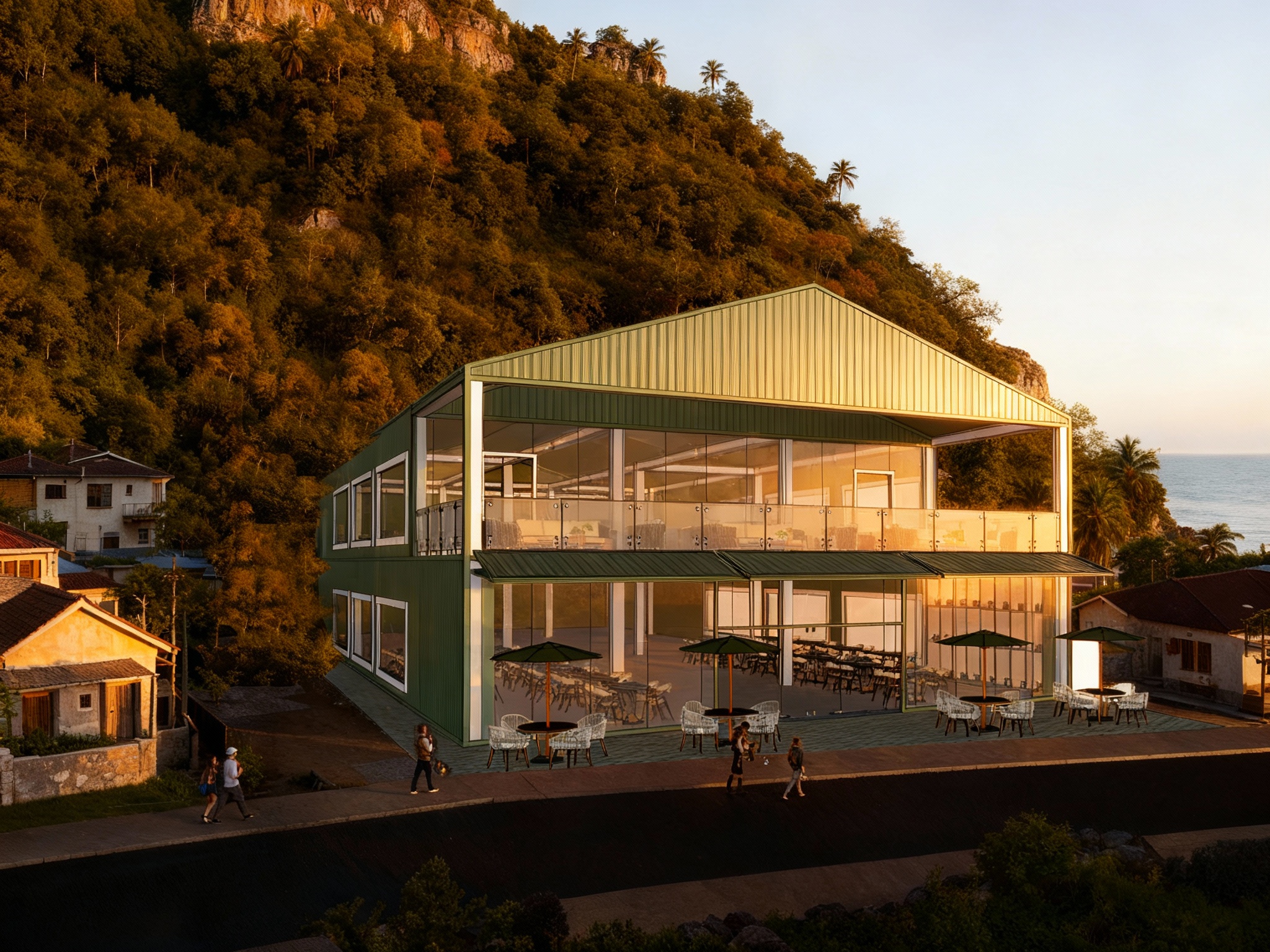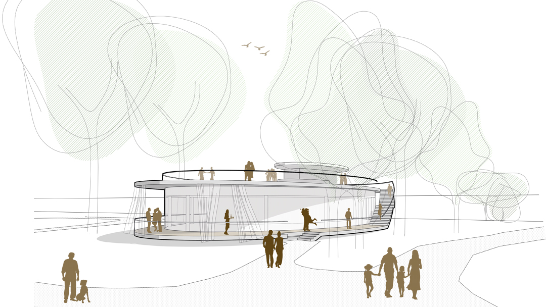 create a rendering for a cafe in a park background with tall deciduous trees sunny weather building facade extensively glazed terrace flooring in wood with a few light white outdoor curtains for sun protection