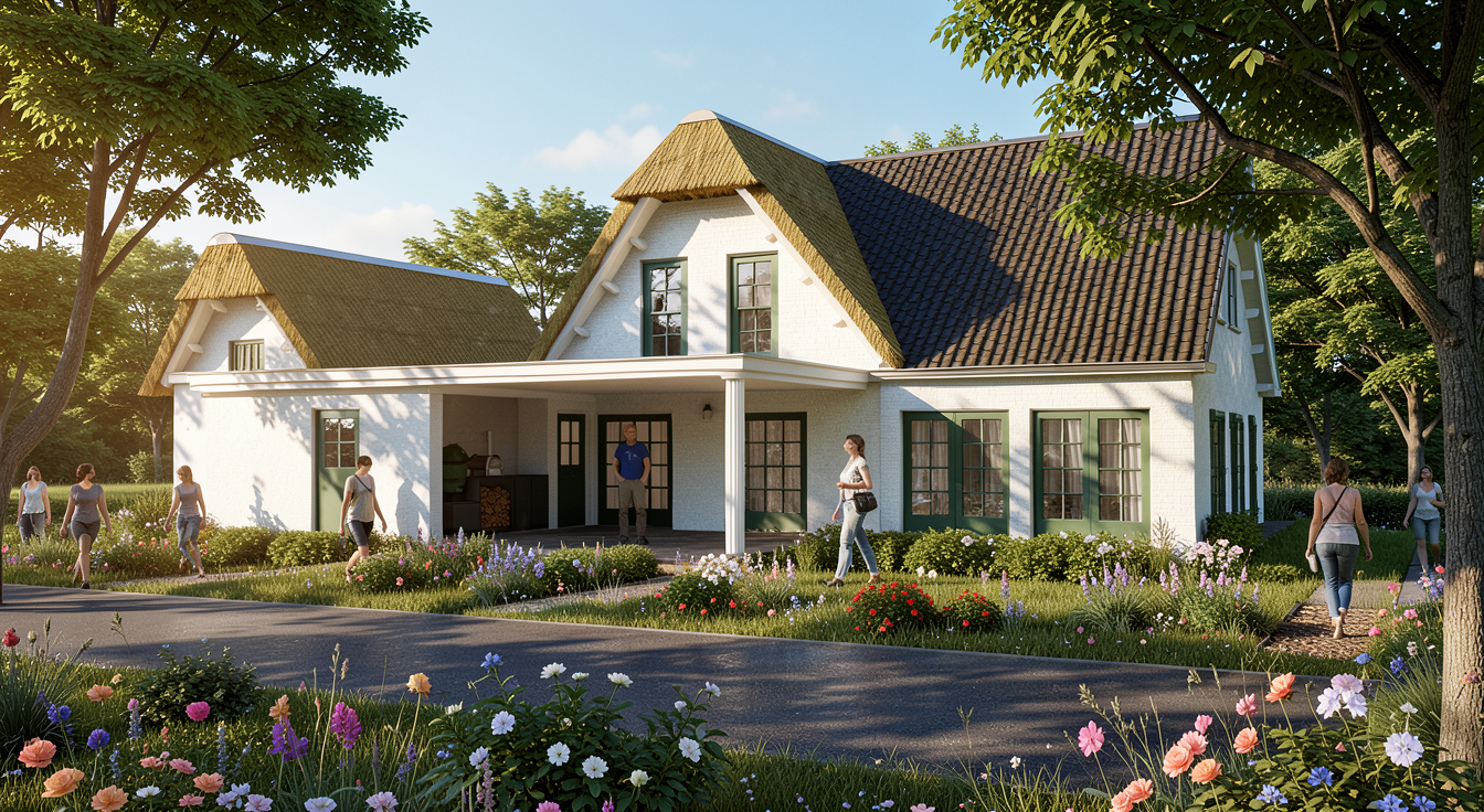 modernist exterior shot this is the loft space of a rental office in a large communal condo building there is a tan leather sofa and small dark stainless steel mini fridge in the loft around the corner is a large conference area with desk chairs lots of bookshelves and a large tv on the wall the tv should display architectural blueprints and a pie chart the ceiling and floor should be in a reddish stained walnut plank with the walnut planks going front to back the windows in the space are behind the camera with golden hour lighting architecture