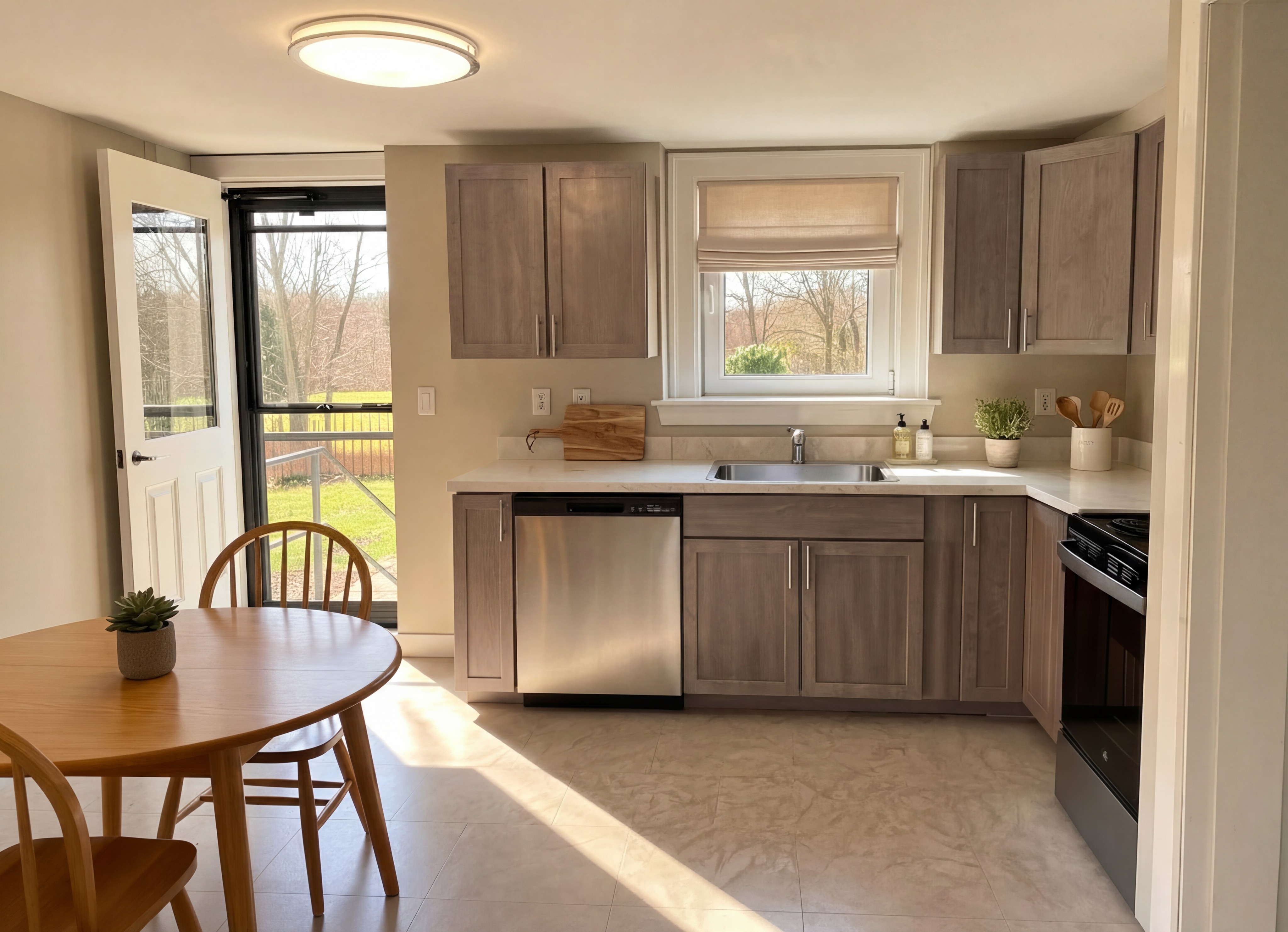 change view out the door and window to match background shown in reference image change nothing else