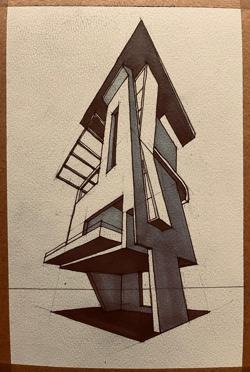 modernist exterior shot realistic render of a concrete a sculpture surrounded by grass natural garden and wooden path ways high trees in the background partly clouded sky architecture