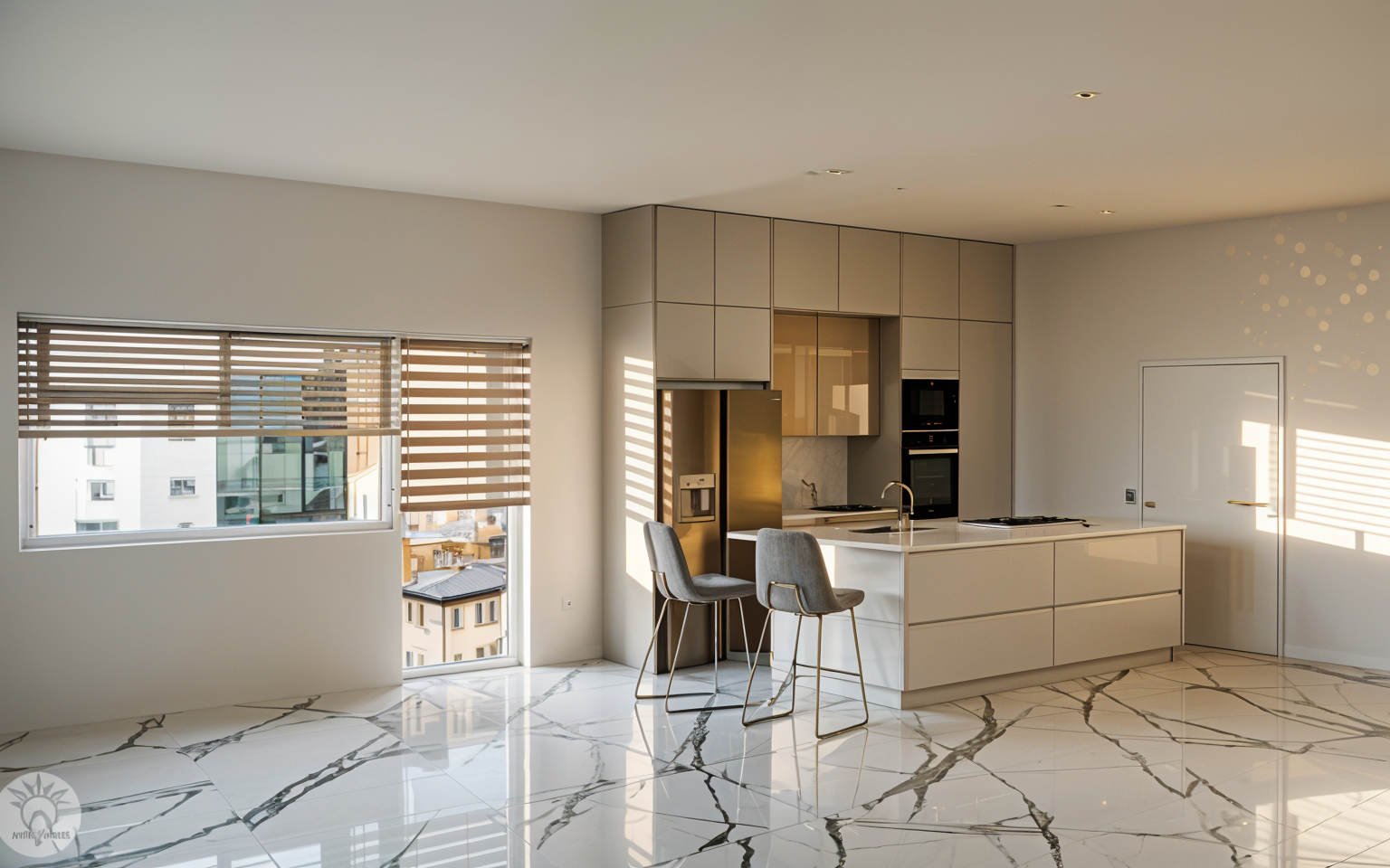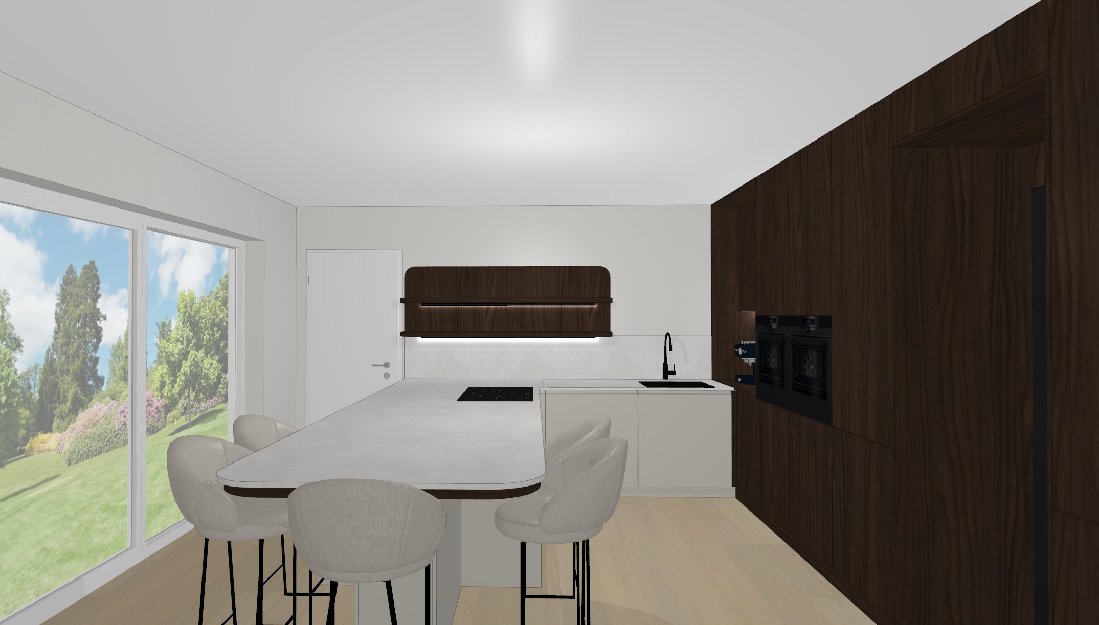 a modern kitchen interior with an elegant atmosphere the cabinets and wall shelves are finished in rich dark wood providing a warm and sophisticated look the countertop is a sleek light greige matt microcement contrasting with the dark wood for a contemporary feel the chairs have a soft beige fabric complimenting the neutral tones of the space the flooring is light hardwood enhancing the room s brightness and warmth the lighting is soft and ambient creating an inviting and refined atmosphere add decor