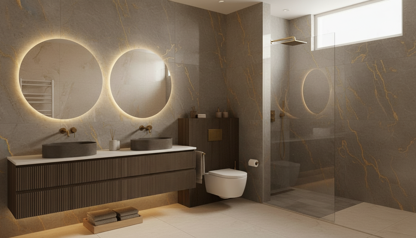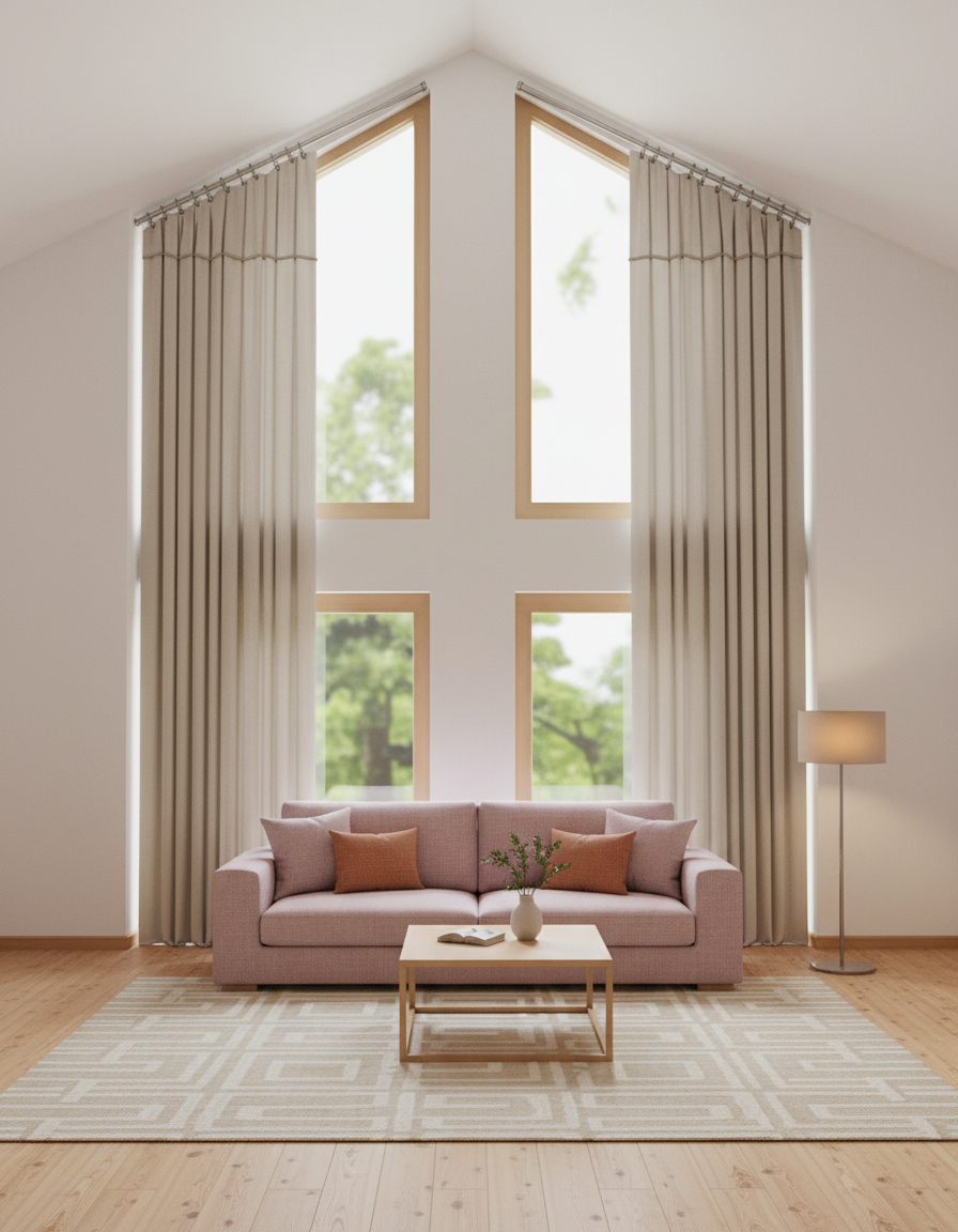 photorealistic interior elevation view of a modern living room wall rendered in a flat orthographic projection no perspective no depth straight on front view like a revit elevation the composition features a centered double height window divided into upper and lower panels on both sides include full height sheer curtains softly draped slightly open with natural vertical folds apply a warm neutral color palette soft beige walls warm taupe tones subtle muted blush accents and light terracotta undertones floor finish shown in elevation as vertical wood panel flooring with realistic natural wood grain and warm tone lighting conditions strong natural daylight entering through the window soft diffused light through sheer curtains gentle shadows no harsh contrast subtle realistic reflections material realism semi transparent sheer fabric with visible texture soft fabric folds and light diffusion natural wood grain variation matte painted walls with slight tonal variation styling constraints no furniture no decor no objects no people rendering style hyperrealistic materials clean minimal calm atmosphere architectural visualization quality important keep the image strictly 2d elevation like no perspective distortion no depth no camera angle shift perfectly flat frontal composition