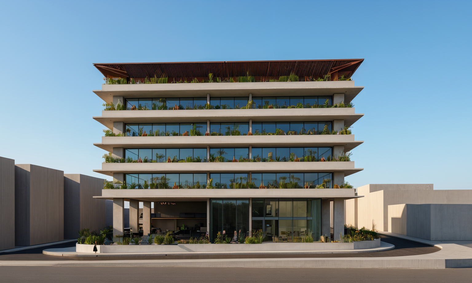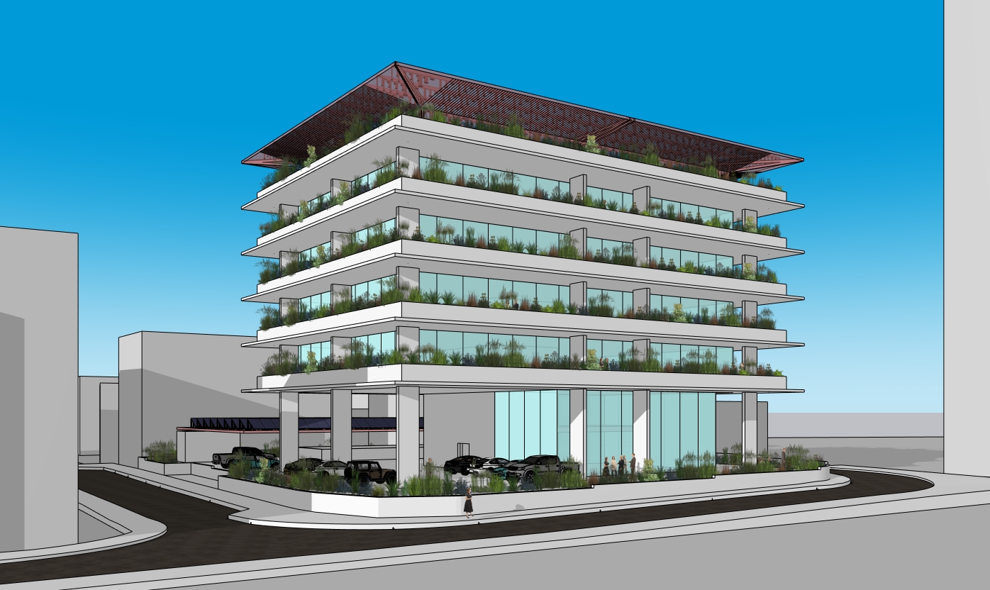 exterior shot soft sunset sky soft shadows city buildings office building lights inside building street lamps cars on road bright lights