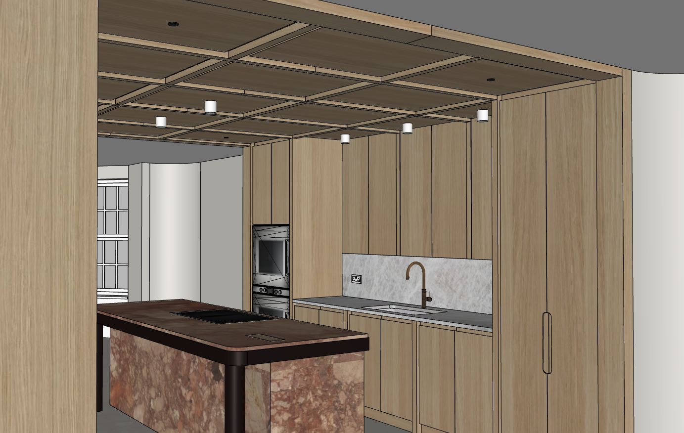 the white downlights only shine light directly down the worktop of the island is in the same marble as the sides of the island