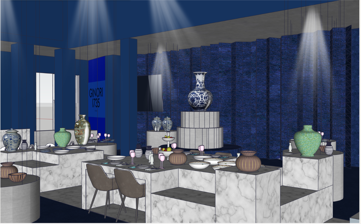ceramic store blue carpet blue walls spotlights for displays stainless steel displays central marble table