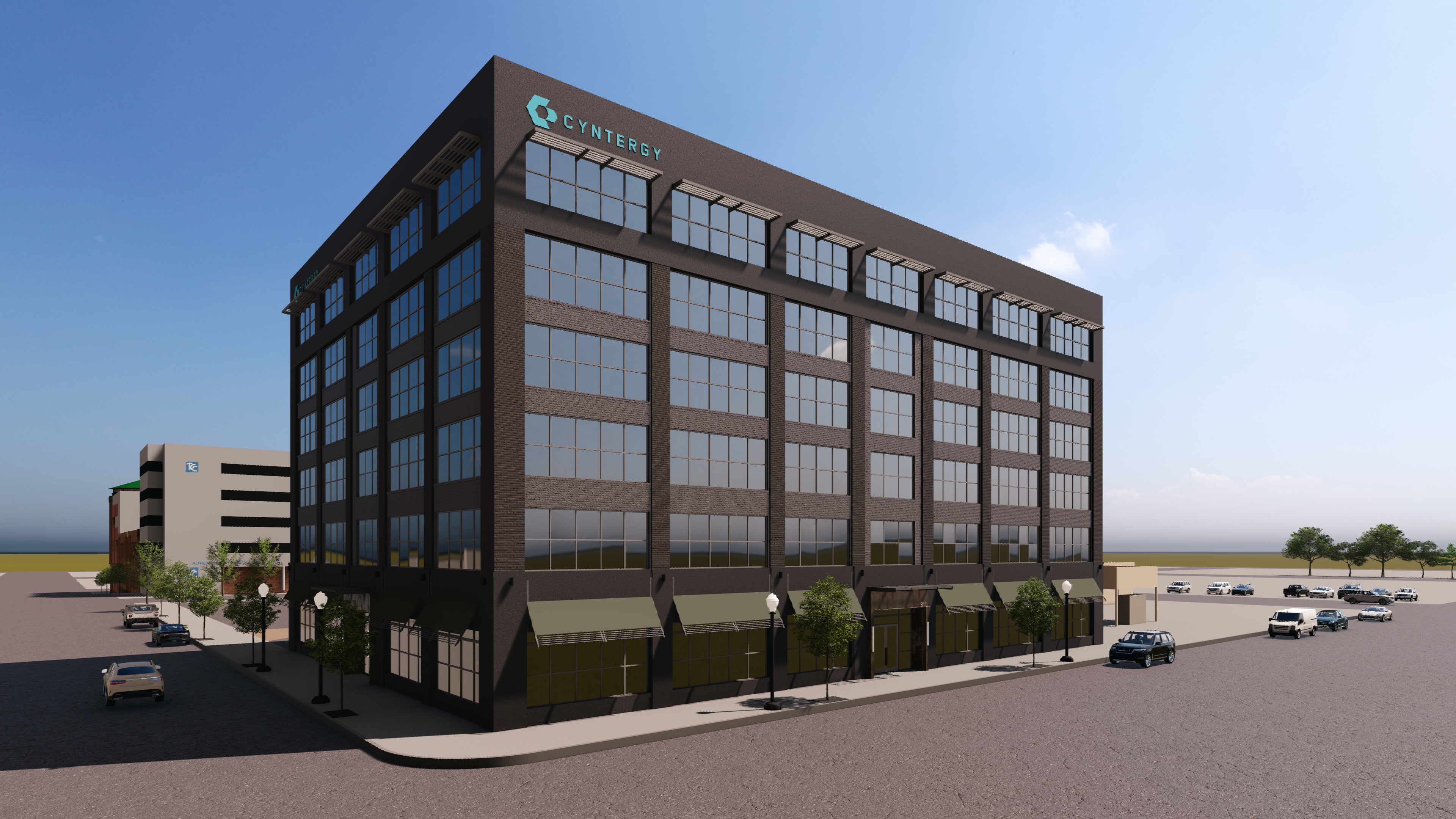 make this building on fire with firetrucks around it