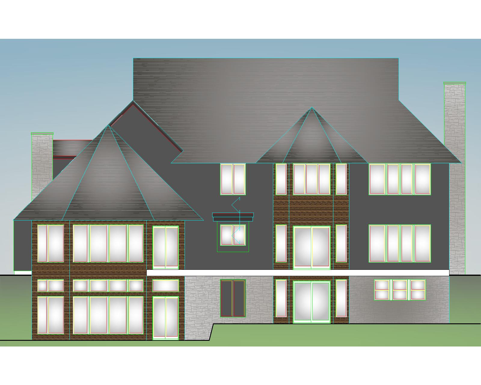make this rendering into a photorealistic rendering of this modern house with nice landscaping and large trees in the foreground there is a large deck on the rear of the house