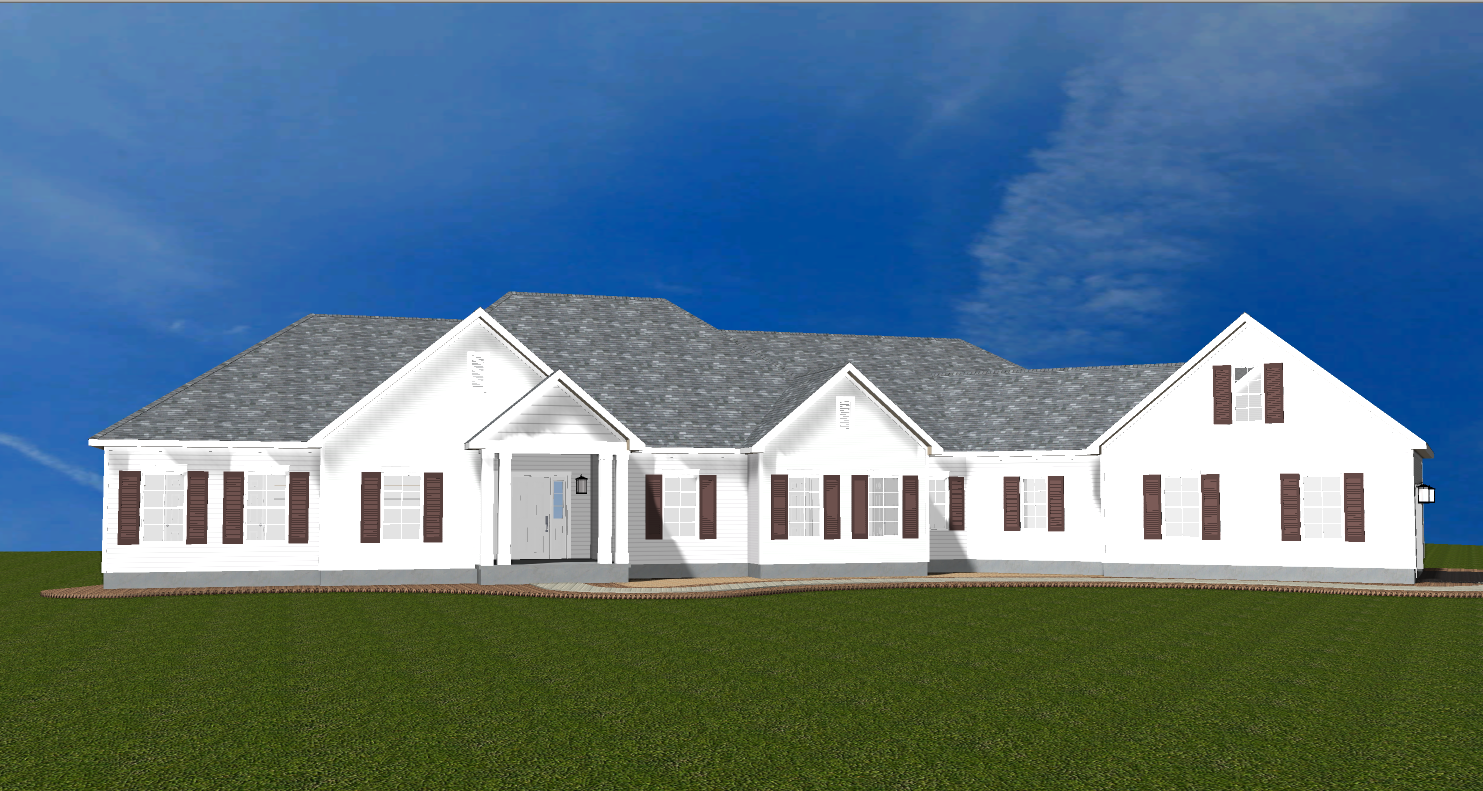 make as photorealistic as possible while keeping textures the same as selection professional landscaping in a lightly wooded scene with good lighting dark grey siding dark roof only match the plan garage as shown on plan