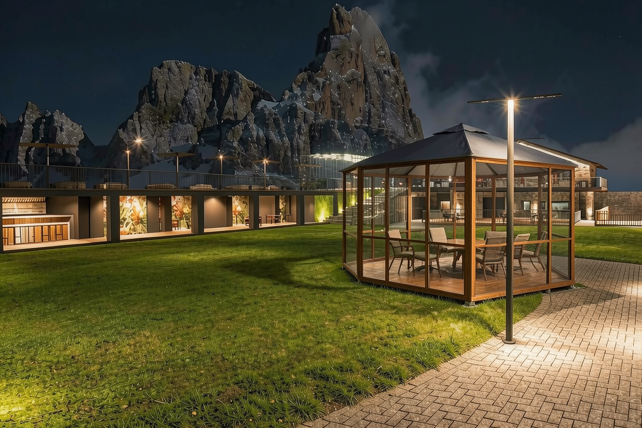 monumental entertainment salon designed as a continuation of a calm meditation space warm earthy palette and low saturation architecture one or two strong color moments such as a vivid artwork a colorful sculptural chair or a bold accent within the circular pit colors like cobalt blue deep red or electric coral used as focal highlights organic marble terrazzo floor large projection wall immersive but balanced atmosphere refined and artistic rather than playful