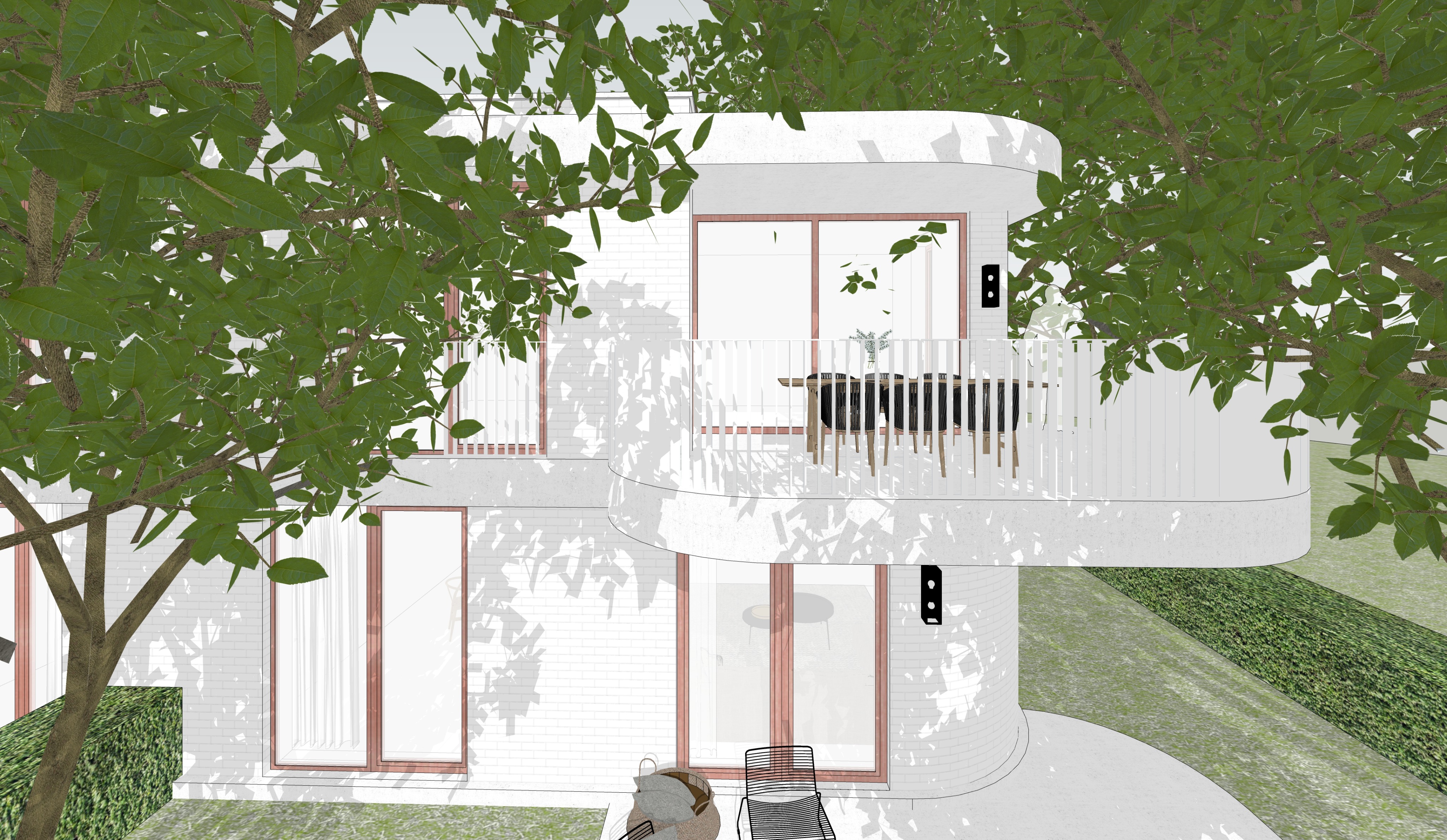 modern building facade with white glazed brick 210 50 mm and light white cream mortar joints combined with smooth white architectural concrete windows and parapets in champagne rose anodized aluminium minimalist contemporary architecture photorealistic materials soft daylight high detail architectural render