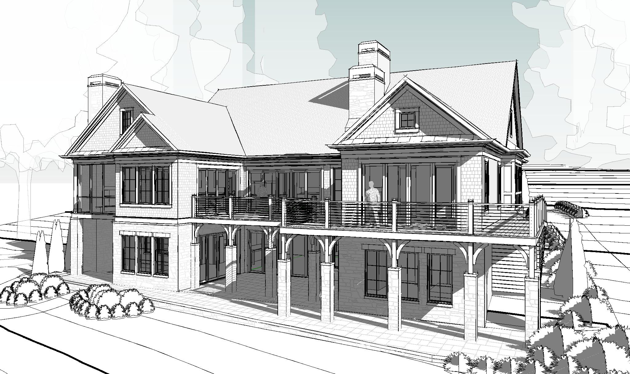 using the provided architectural drawing create a professional photorealistic architectural rendering keeping all of the architecture and details exactly the same applying the following materials and colors roof wood shake roof shingles shingle walls use nucedar shingle siding in the color argos trim a warm white color windows a warm white color stone base a random rubble pattern with a mixture of grays and browns add trees to the background make the chimney caps a dark bronze color and make the metal roof accents a dark bronze metal color
