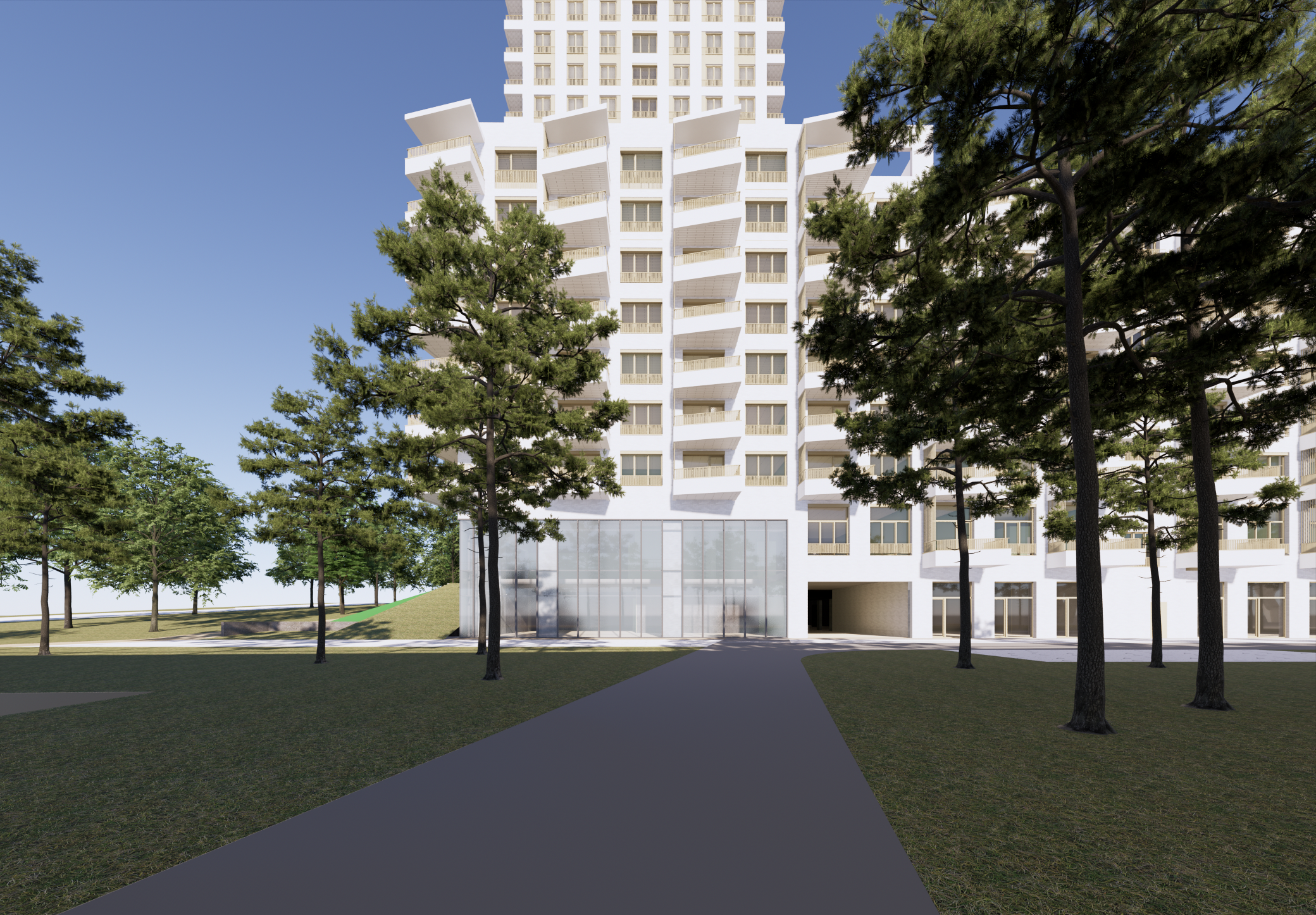 architectural visualization of the same contemporary building with identical geometry proportions fa ade elements and materials change fa ade finish to terracotta colored plaster not brick while preserving all textures and details balconies have thin vertical plaster patterns warm summer afternoon with soft sunlight from the right a few clouds and window reflections add greenery more trees on the left trees and high grass plus a basketball court on the right ground level active with caf s shops terraces and interior lights upper floors show lit interiors with dark curtains add people walking no cars only atmosphere light and mood may change no new buildings