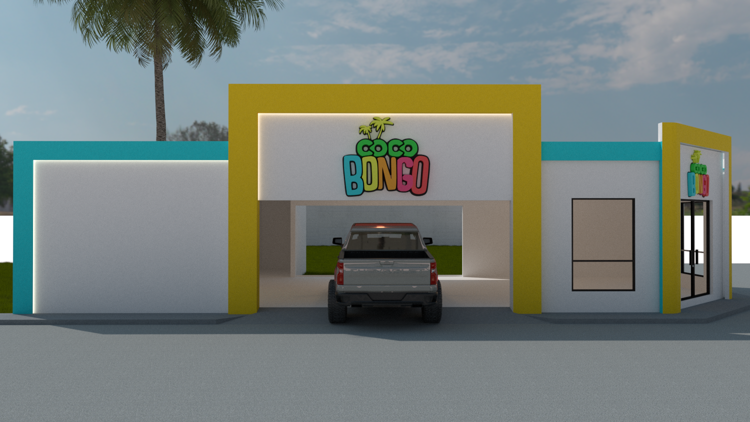 keep everything as is high quality materials modern drinks business clear windows with soft reflection realistic street and sidewalk sunny sky