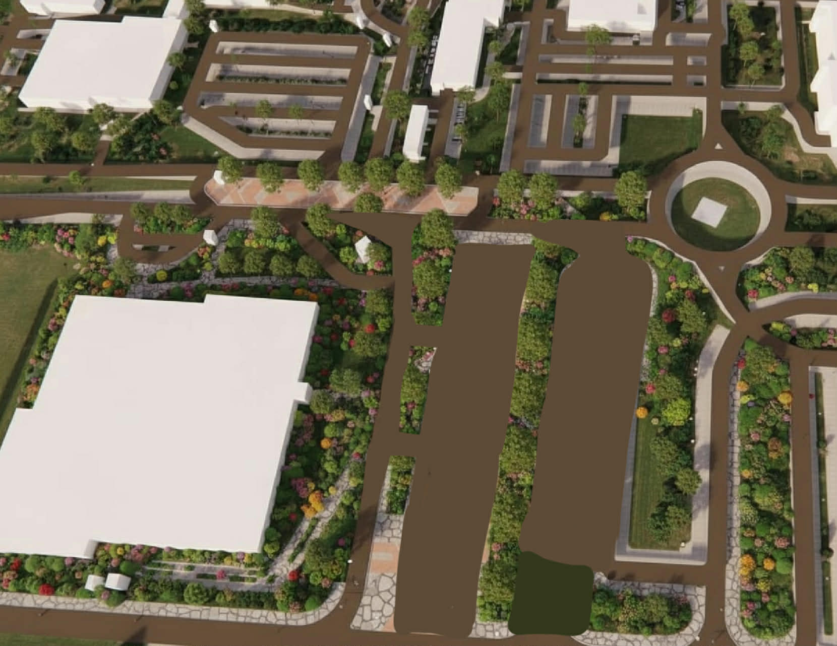 a manicured lawn layered flower beds low maintenance shrubs native plants stone pathway leading to the entrance