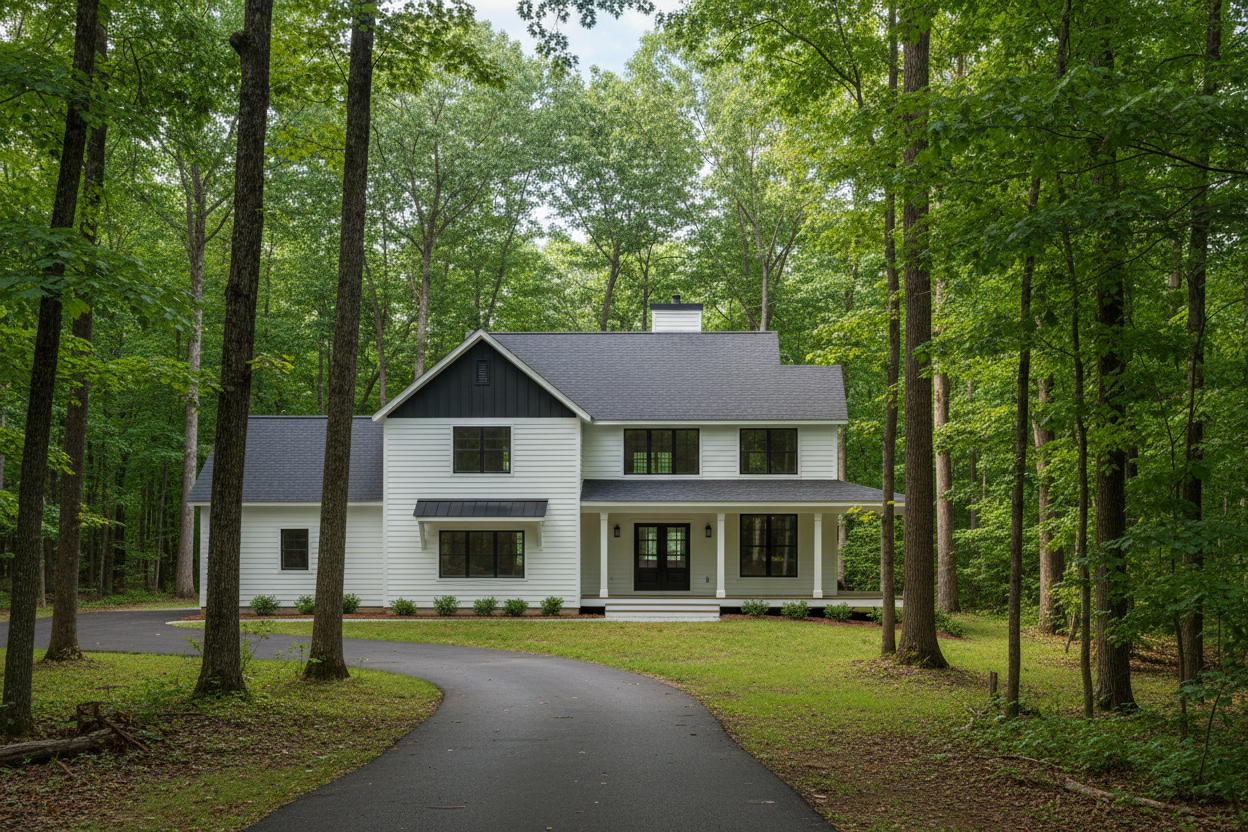 leave structurally intact white lap siding with board and batten roof peaks black roof in a forest driveway