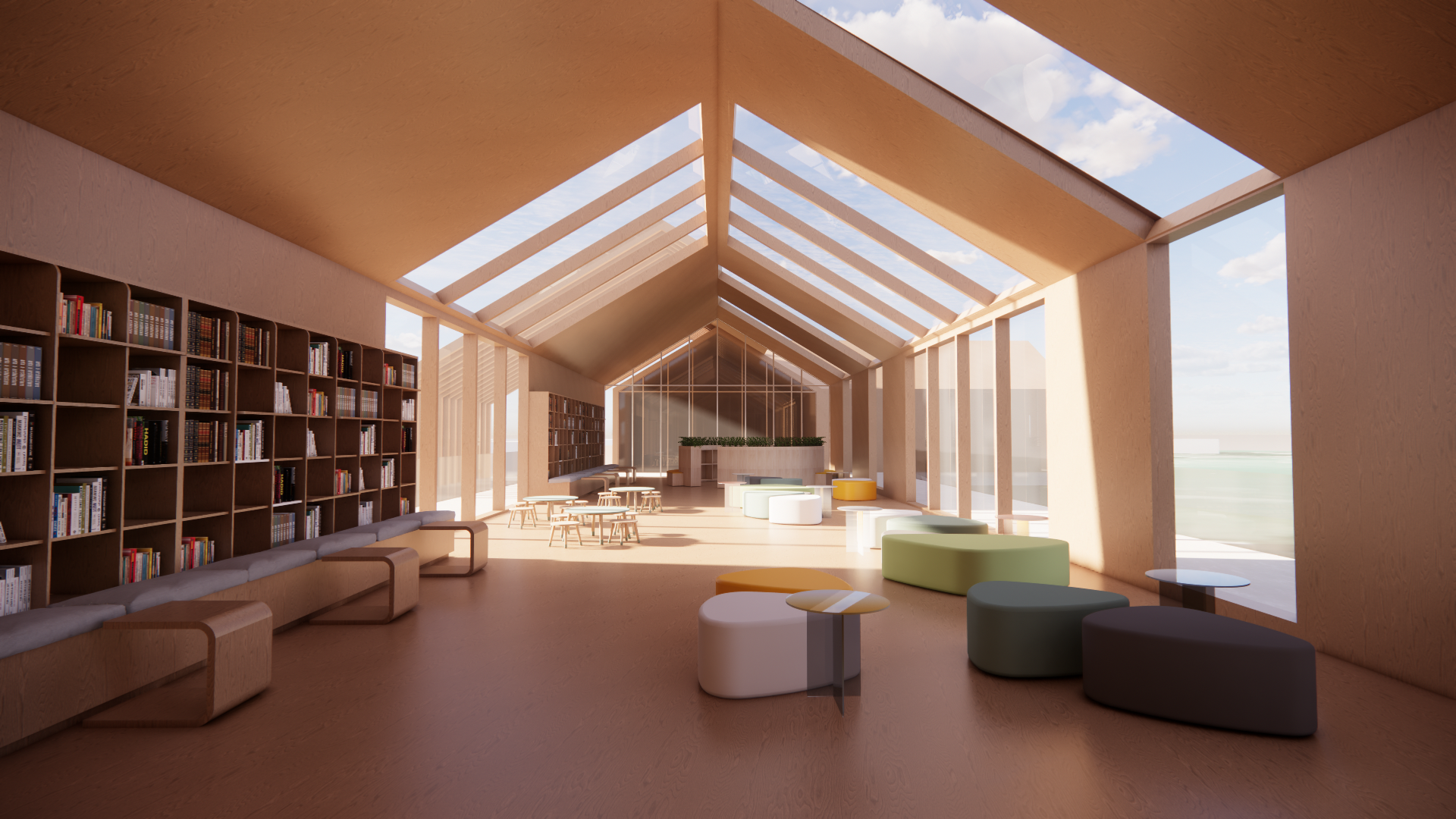 keep this exact image composition and do not modify move or remove any existing architecture furniture shelving or layout preserve all geometry proportions glazing and materials exactly as shown enhance the scene into a contemporary elementary school creative library by only adding elements to increase realism and atmosphere populate the existing bookshelves with realistically scaled books books should vary in size color and orientation with a natural slightly imperfect arrangement including some horizontal stacks and gaps add subtle life to the space without clutter a few small objects such as books or notebooks placed on tables minimal decorative items introduce plants in a restrained and intentional way small potted plants on some tables a few medium sized plants placed near columns or at the back avoid overuse add a clear and consistent lighting system evenly spaced pendant lights aligned along the central axis or structural rhythm all fixtures should match in size height and spacing warm soft light that complements the daylight optional subtle integrated lighting within bookshelves maintain strong natural daylight from skylights and glazing as the primary light source ensure all added elements are properly scaled for a space with a 20 foot ceiling maintain a warm minimal scandinavian inspired atmosphere with natural wood tones and muted colors no people no clutter no changes to architecture or existing furniture only add elements to enhance realism