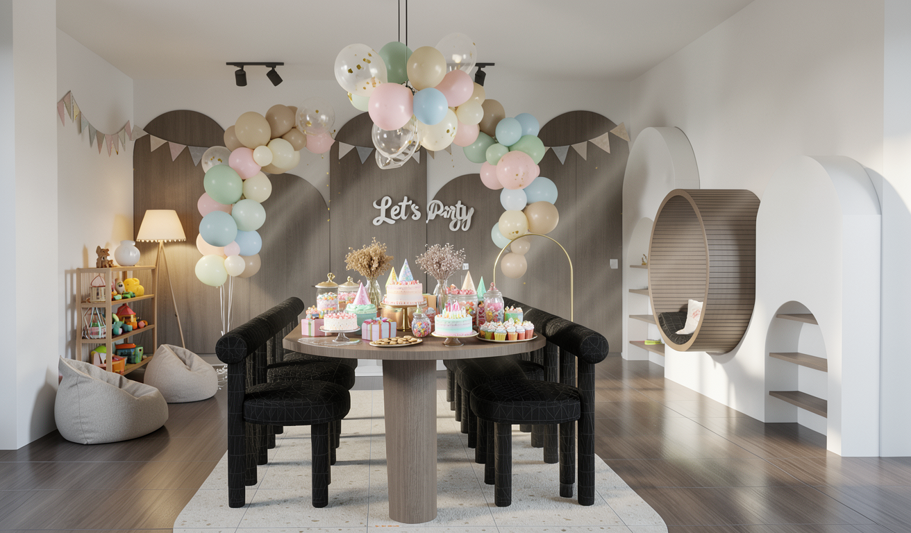 render the existing interior space exactly as it is do not change architecture layout furniture textures walls ceiling floors or materials keep all original objects and textures intact add minimal birthday decoration only elegant balloon arrangement in beige cream soft sage plus a few pastel balloons in light pink soft blue and mint organic balloon arch with varying sizes transparent helium balloons with subtle gold confetti modern matte white let s party sign fill the table with fully abundant playful decorations multiple detailed birthday cakes cupcakes with pastel frosting colorful sweets and candies in jars mini cookies tiny gift boxes party hats small vases with dried flowers decorative trays all carefully arranged to look joyful and abundant without moving the table on the left side of the room add playful birthday elements a small stand with gift boxes a mini birthday cake display or a few fun balloons integrated naturally with the room maintain original lighting shadows camera angle and all textures add hyper realistic rendering soft volumetric light rays cinematic soft shadows subtle floor reflections depth of field realistic fabric and material details global illumination ray tracing physically based rendering pbr 35mm real camera lens high dynamic range ultra detailed textures 8k resolution photorealistic architectural visualization magazine style interior photography joyful playful atmosphere suitable for children s birthday party