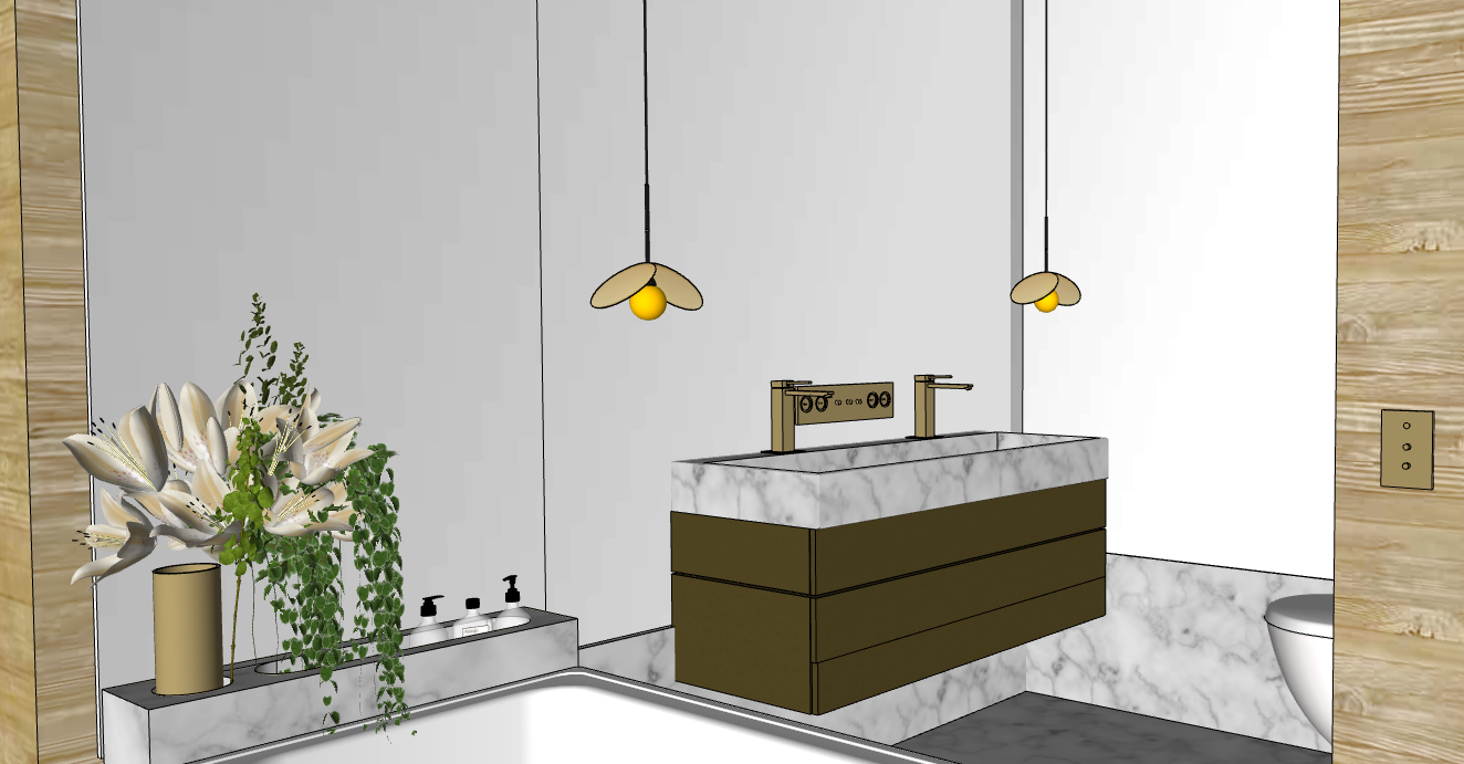 realistic rendering of this sketchup view of a luxury bathroom the wall are all covered by customized miroir the fourniture is made buy metal bronze and calacatta gold marble the finishes of the lights and faucet are gold laiton on the right is a luxury discret switch botton