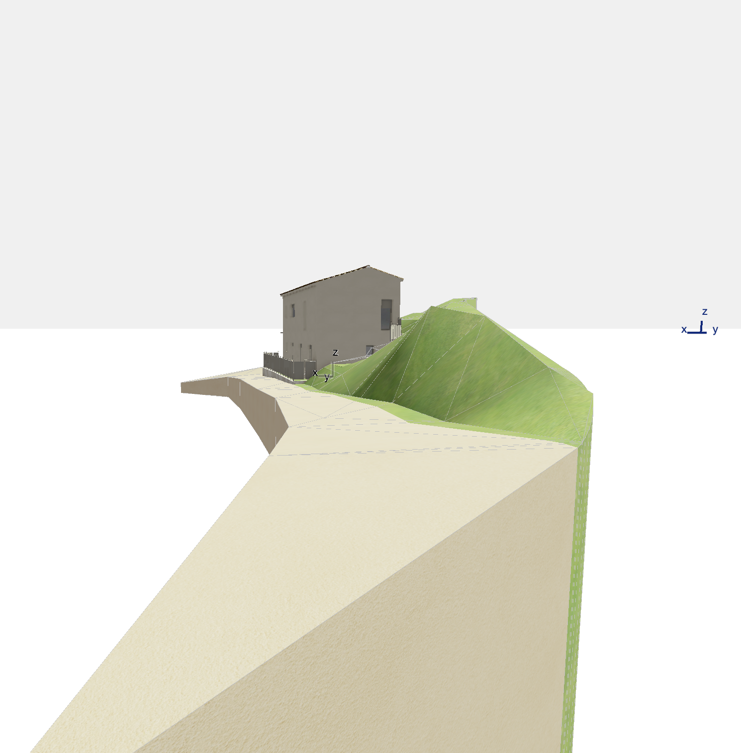 the path is in beige gravels the fences are in metal and the house is brand new a lot of tree shadows on the facade the color of the fence and shutters are ral 7030 the facade is color prb gibraltar no fence along the way more shadows and sunlight